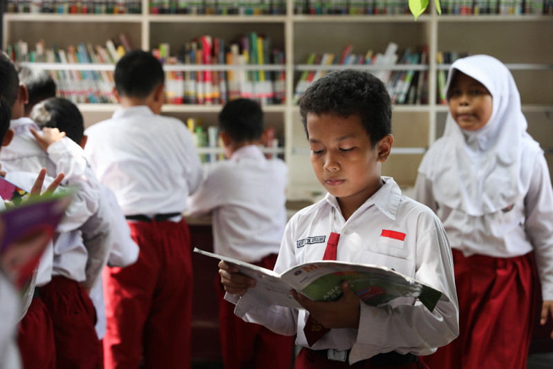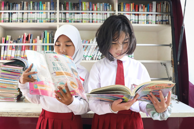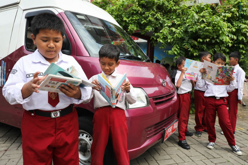 Sejumlah siswa membaca buku koleksi mobil perpustakaan keliling Suku Dinas Perpustakaan dan Kearsipan (Sudin Pusip) Jakarta Selatan di SDN Pejaten Timur 01 Pagi, Pasar Minggu, Jakarta Selatan, Senin (5/2). Sudin Pusip Jakarta Selatan melayani sebanyak 10 mobil perpustakaan keliling yang tersebar ke berbagai sekolah setiap harinya.