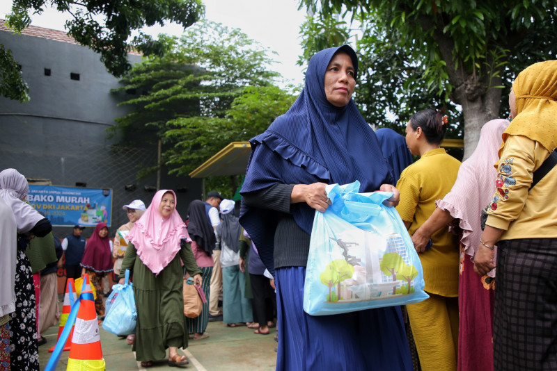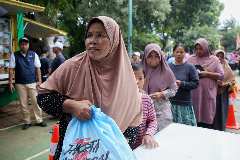 Warga terlihat antusias saat belanja paket sembako murah yang digelar di RPTRA H. Oyar, Pegangsaan Dua, Kelapa Gading, Jakarta Utara, Senin (5/2). Kegiatan pasar sembako murah yang ditinjau langsung oleh Pj Gubernur DKI Jakarta, Heru Budi Hartono ini menjual 500 paket sembako serta 500 sembako eceran.