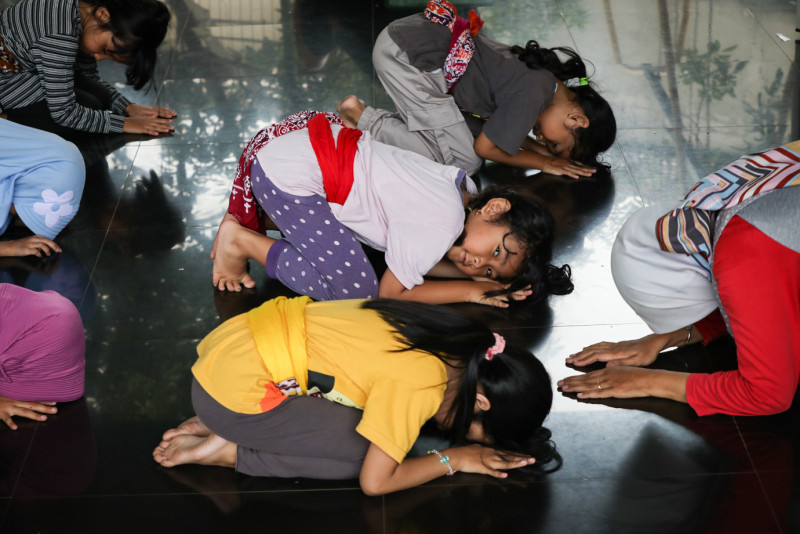 Sejumlah siswa SD Islam An Nuriyah berlatih ekstrakurikuler menari di RPTRA Cipedak Gemilang, Jagakarsa, Jakarta Selatan, Senin (5/2). Pelatihan tari tradisional yang dipandu oleh instruktur binaan Suku Dinas (Sudin) Kebudayaan Jakarta Selatan tersebut digelar setiap Senin pukul 13.30 sampai 16.00.