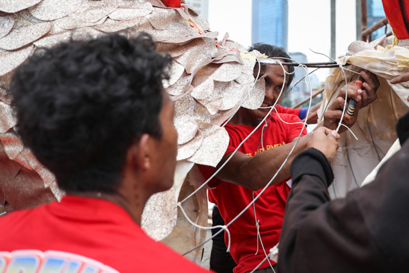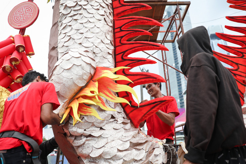 Sejumlah pekerja mengerjakan pembuatan instalasi naga dan ornamen bernuansa Imlek di Bundaran Hotel Indonesia (HI), Jalan Sudirman-Thamrin, Menteng, Jakarta Pusat, Rabu (7/2). Dinas Pertamanan dan Hutan Kota (Distamhut) DKI Jakarta memasang instalasi dan ornamen tersebut dalam rangka menyemarakkan Tahun Baru Imlek 2575 Kongzili yang jatuh pada 10 Februari 2024. #Imlek2024