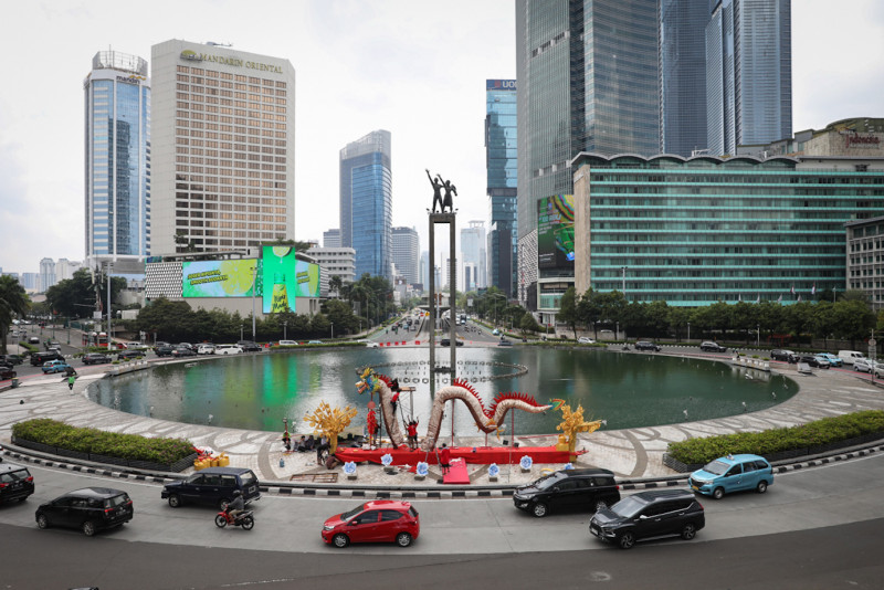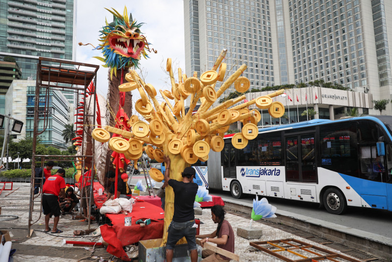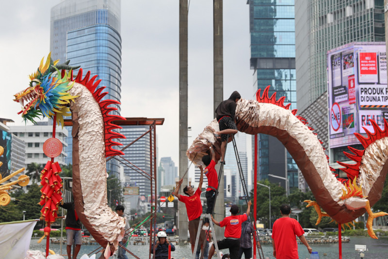 Semarakkan Imlek, Distamhut Pasang Instalasi Naga di Bundaran HI