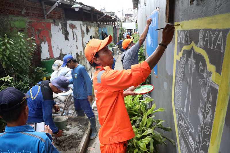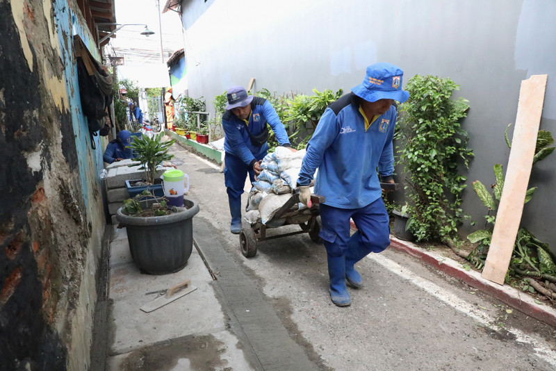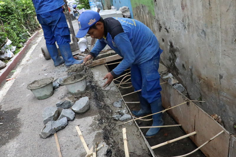 Petugas gabungan dari Penanganan Prasarana dan Sarana Umum (PPSU) dan Satuan Pelaksana Sumber Daya Air (Satpel SDA) mengerjakan penataan kawasan unggulan di Jalan Kali Pasir, RT 10/01, Cikini, Menteng, Jakarta Pusat, Rabu (7/2).