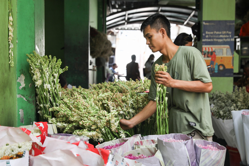 Sejumlah pedagang bunga sedap malam melayani pembeli di Pasar Bunga Rawa Belong, Kebon Jeruk, Jakarta Barat, Kamis (8/2). Permintaan bunga sedap malam meningkat jelang perayaan Tahun Baru Imlek 2575 Kongzili yang jatuh pada Sabtu, 10 Februari 2024. #Imlek2024