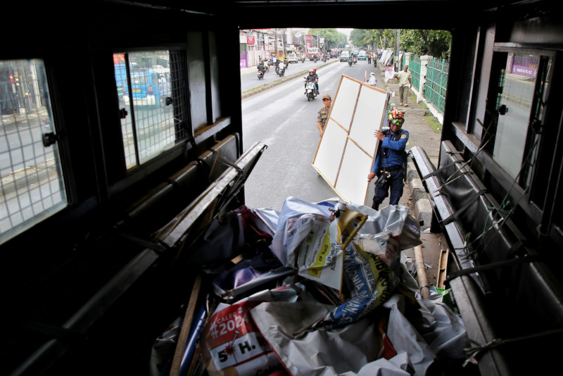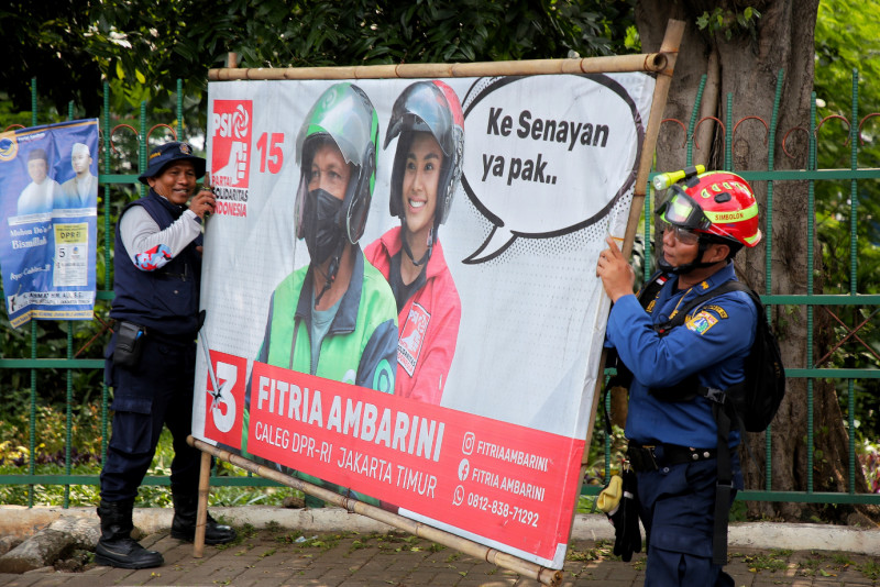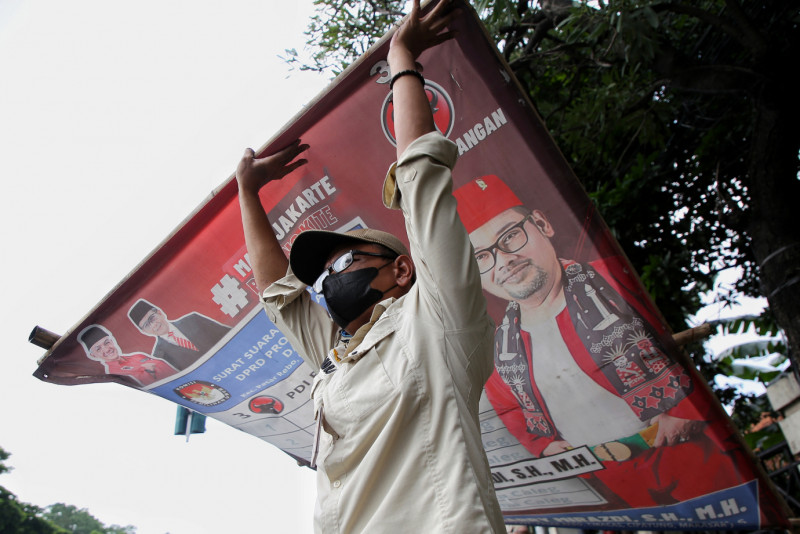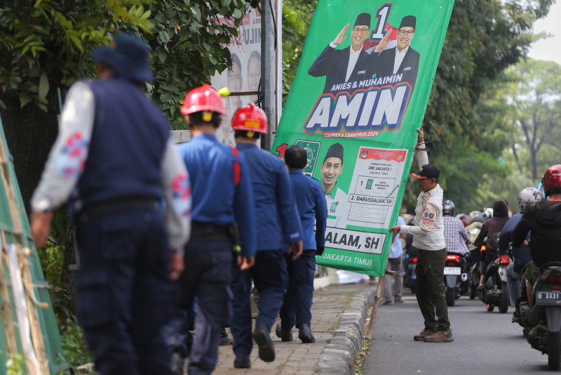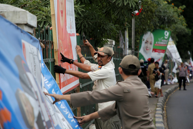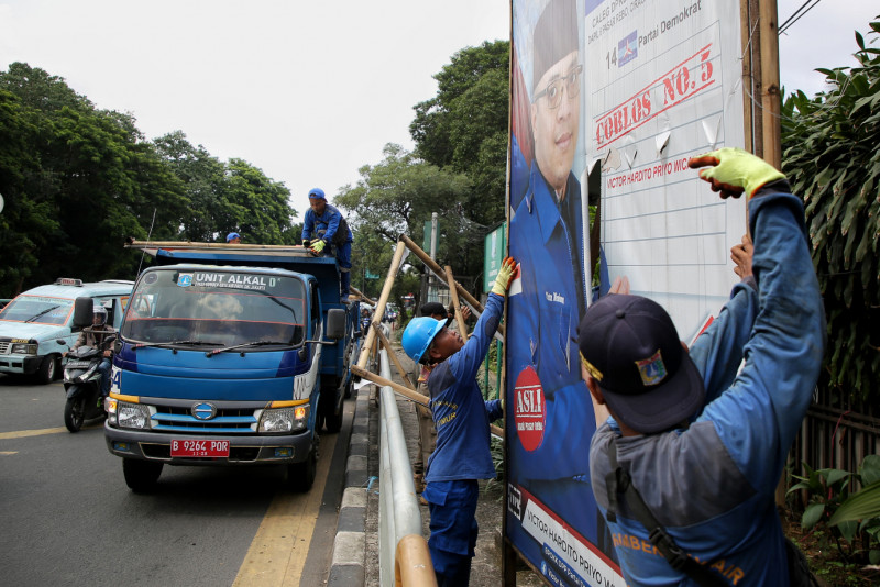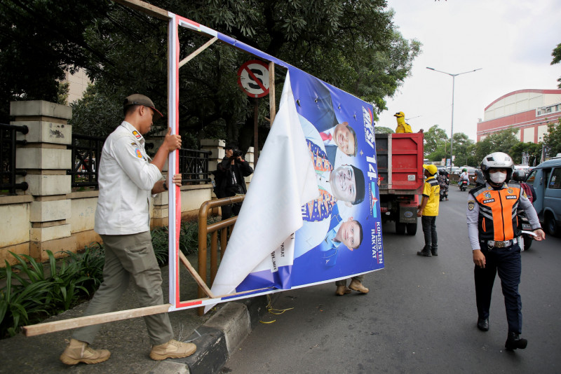 Petugas gabungan melakukan penertiban Alat Peraga Kampanye (APK) di Jalan Raya Bogor, Ciracas, Jakarta Timur, Minggu (11/2). Penertiban APK ini dilakukan secara serentak di lima wilayah DKI Jakarta setelah berakhirnya masa kampanye dan mulai memasuki masa tenang.