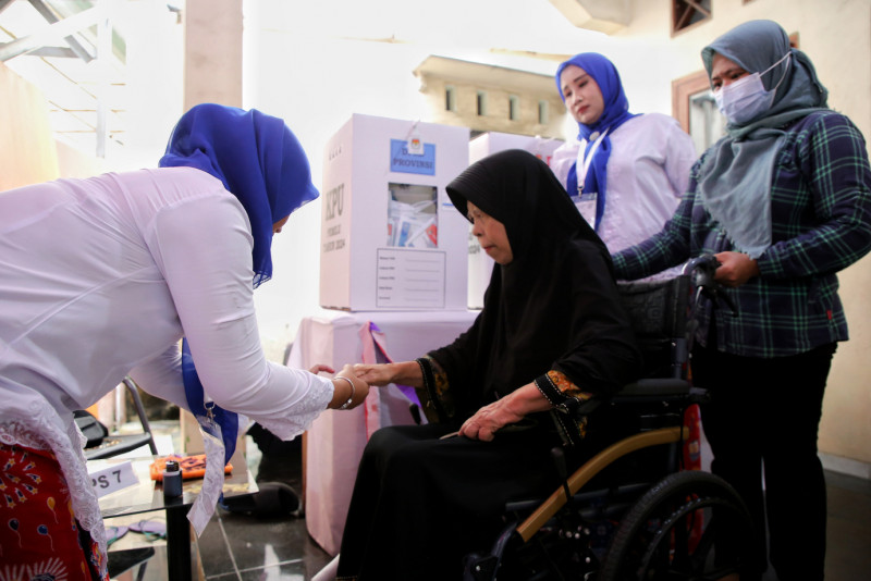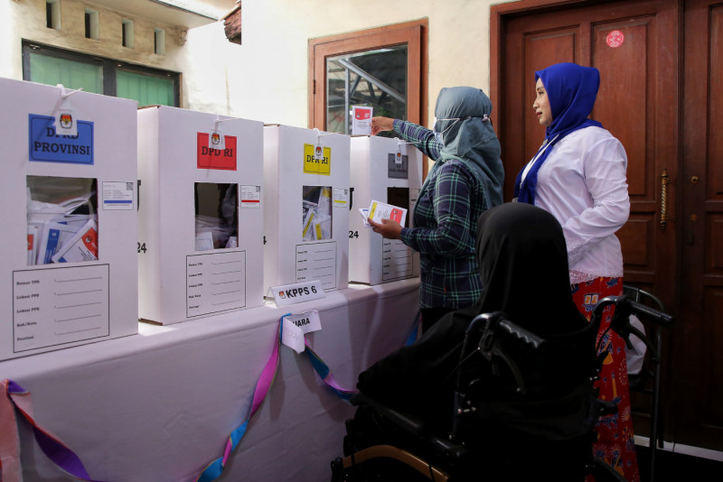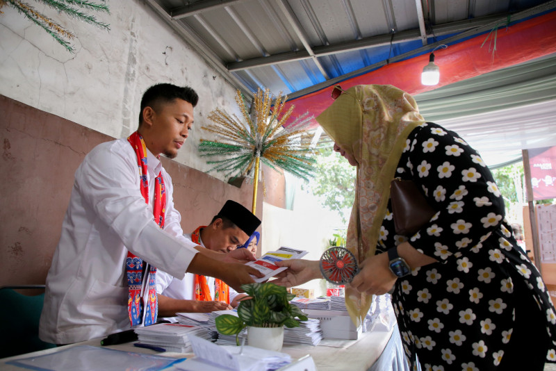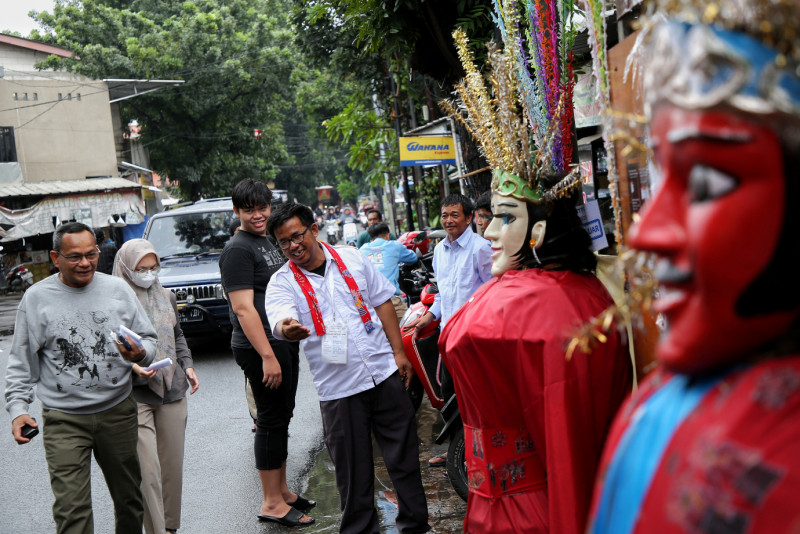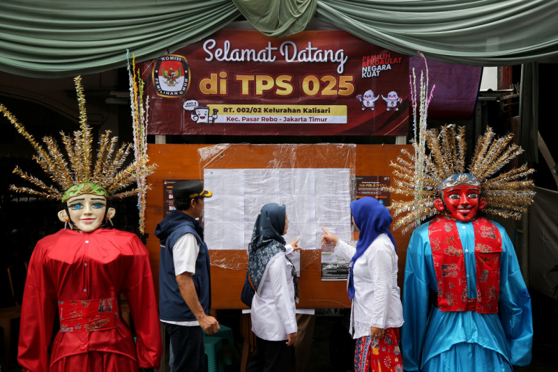 Melihat TPS dengan tema betawi di TPS 024 dan TPS 025 di Jalan Kalisari II, RW 02, Kelurahan Kalisari, Kecamatan Pasar Rebo, Jakarta Timur (14/2). Selain diramaikan dengan ornamen khas betawi, di TPS ini seluruh anggota KPPS pria mengenakan pakaian Sadaria khas Betawi dan anggota KPPS perempuan mengenakan Kebaya Encim khas Betawi.
