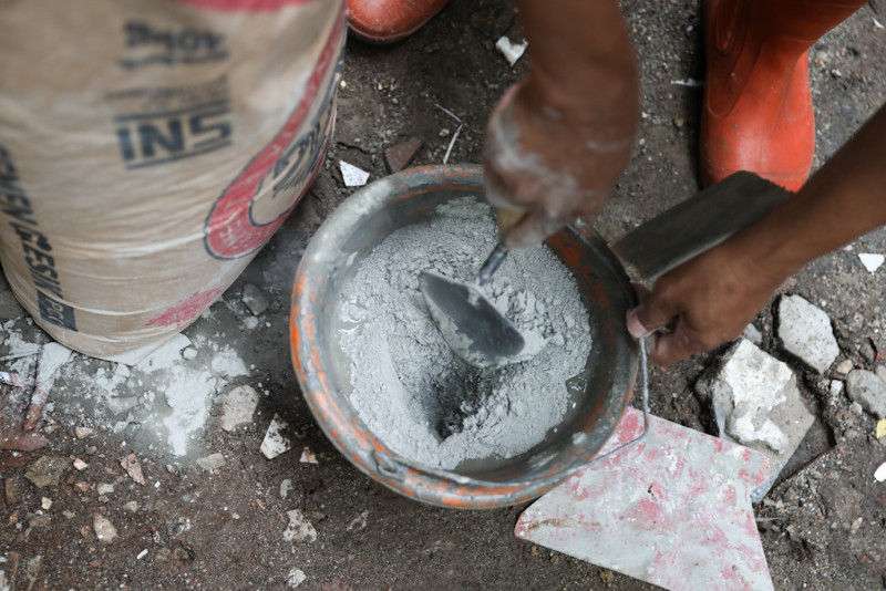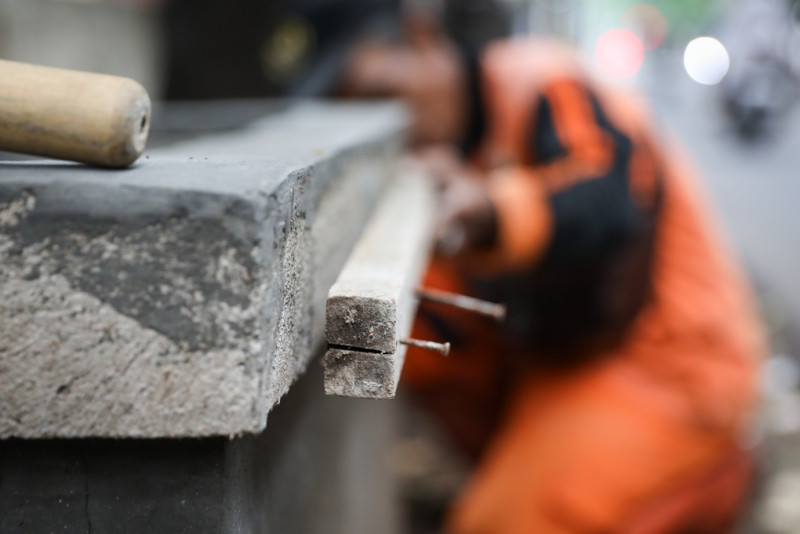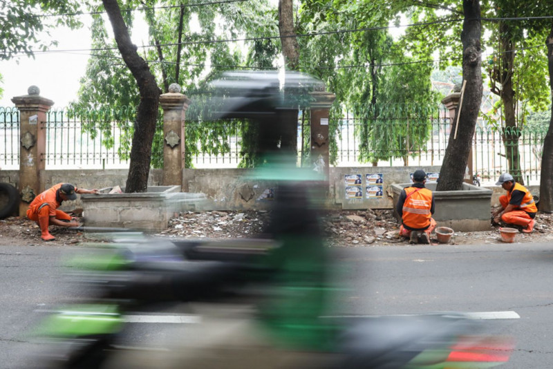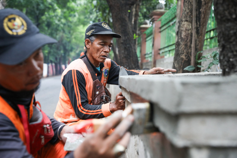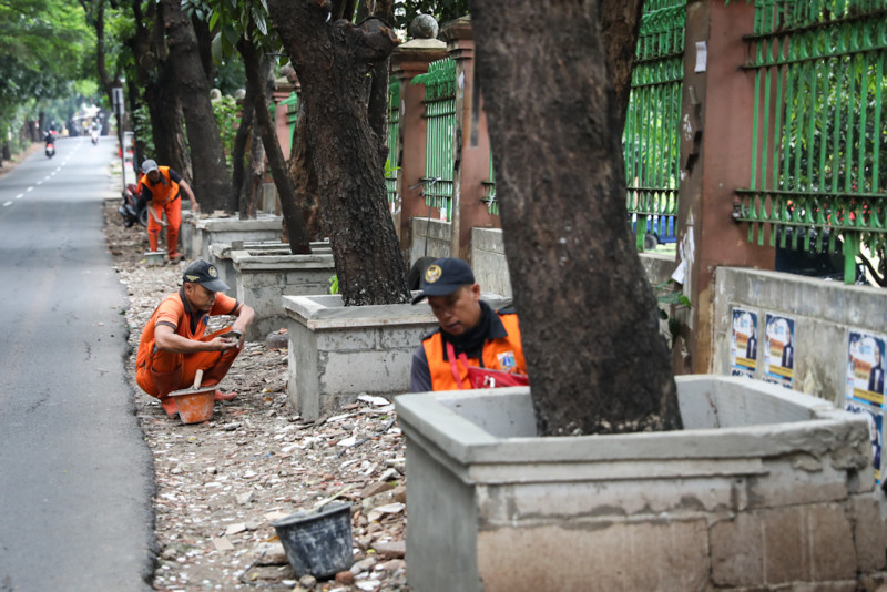 Sebanyak delapan petugas Penanganan Prasarana dan Sarana Umum (PPSU) Kelurahan Lubang Buaya mengerjakan penataan kawasan unggulan triwulan I di Jalan Monumen Pancasila Sakti, Cipayung, Jakarta Timur, Kamis (15/2). Untuk penataan awal kawasan tersebut, PPSU Lubang Buaya mengerjakan pembuatan bak pohon permanen di sisi jalan sepanjang 170 meter.