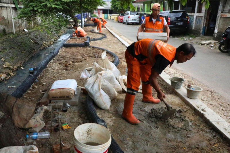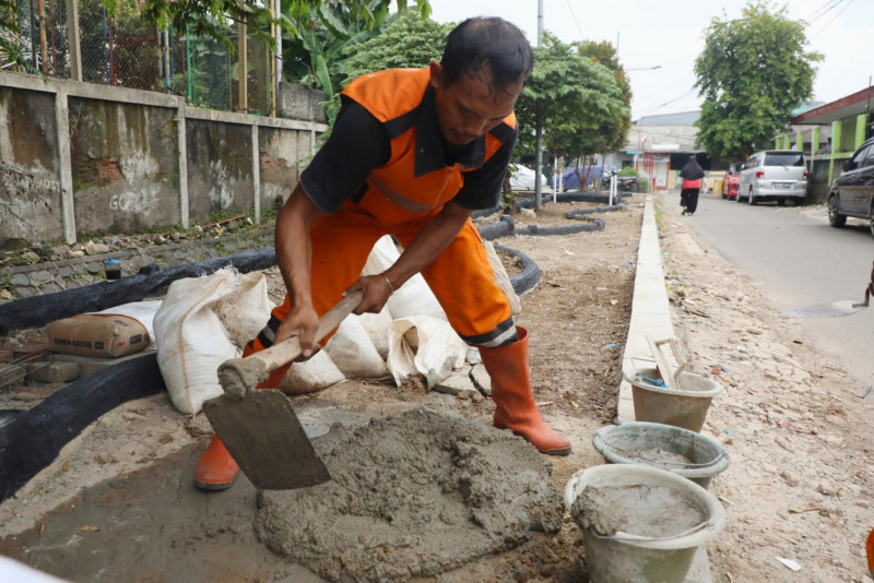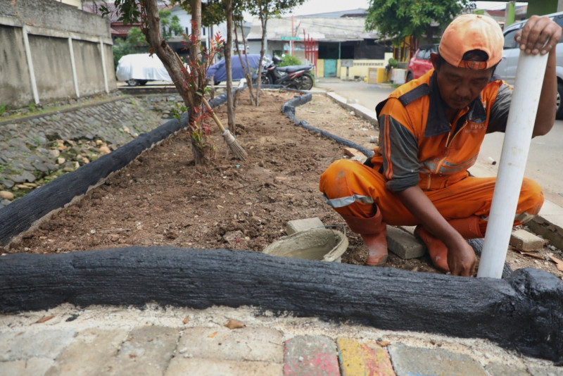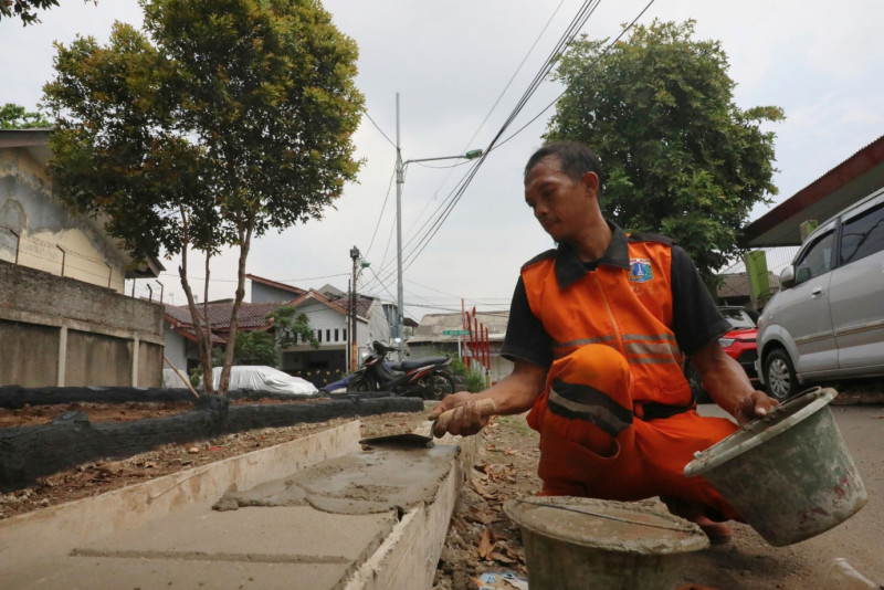Petugas Penanganan Prasarana Sarana dan Umum Kelurahan Malaka Jaya menata lahan sepanjang 60 meter dan lebar tiga meter untuk dijadikan tempat penataan kawasan unggulan triwulan I di Jalan Nusa Indah VI, Duren Sawit, Jakarta Timur, Senin (19/2). Penataan unggulan ini nantinya akan dilengkapi fasilitas area refleksi dan joging track.