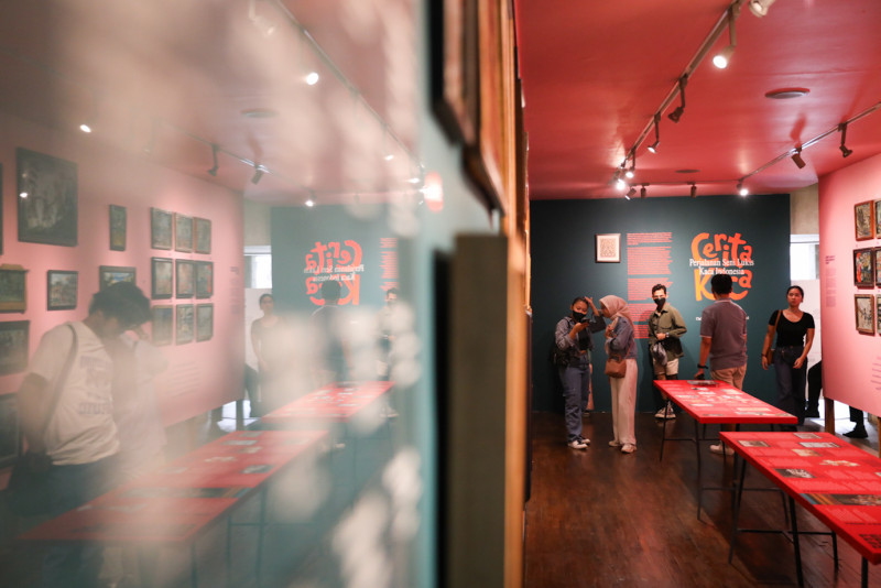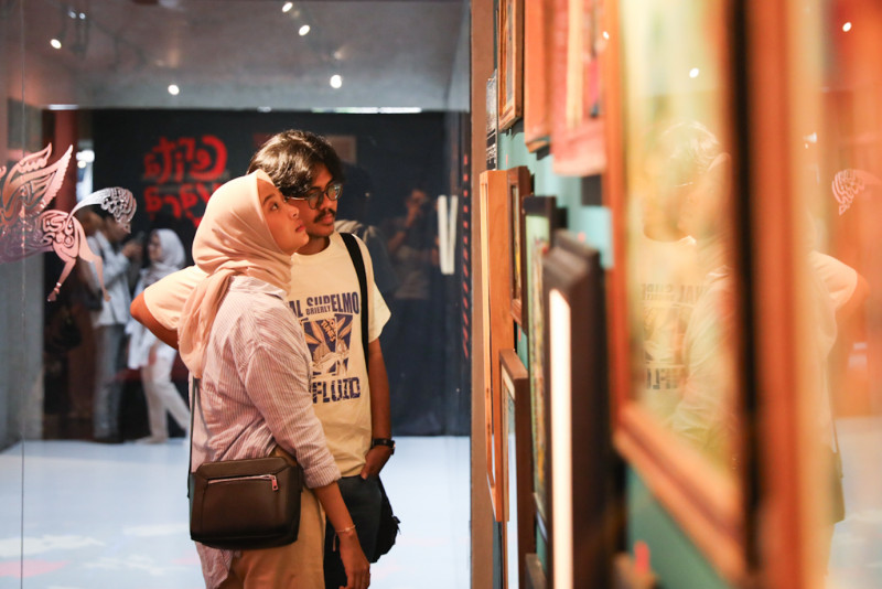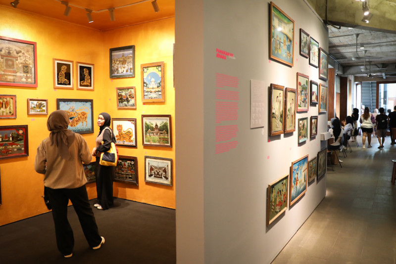 Sejumlah pengunjung mengamati karya-karya yang dipamerkan dalam Pameran Cerita Kaca: Perjalanan Seni Lukis Kaca Indonesia di Dialogue Artspace, Mampang Prapatan, Jakarta Selatan, Senin (19/2). Pameran Cerita Kaca terbuka untuk umum secara gratis dan berlangsung pada 4 Februari hingga 11 April 2024 pukul 11.00 - 20.00.