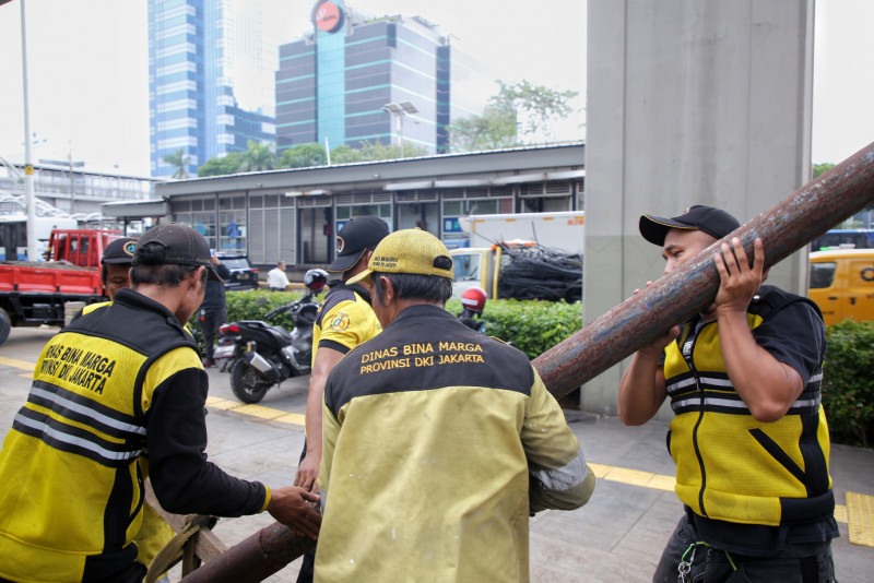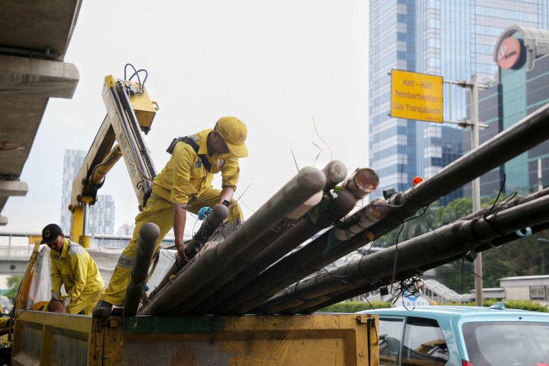 Petugas Dinas Bina Marga DKI Jakarta mencabut tiang kabel utilitas di sepanjang Jalan MT Haryono, Cikoko, Pancoran, Jakarta Selatan, Senin (19/2). Puluhan tiang tersebut dilakukan secara bertahap setelah pemindahan kabel utilitas udara ke dalam Sarana Jaringan Utilitas Terpadu (SJUT) di bawah tanah.