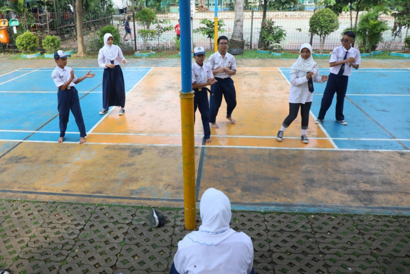 Sejumlah anak sekolah memanfaatkan Ruang Publik Terpadu Ramah Anak (RPTRA) DKI Berseri yang terletak di Jalan Perumkar DKI, Pondok Kelapa, Duren Sawit, Jakarta Timur menjadi tempat edukasi, Senin (19/2). Para pengunjung berlatih senam, belajar kelompok dan bermain di RPTRA.