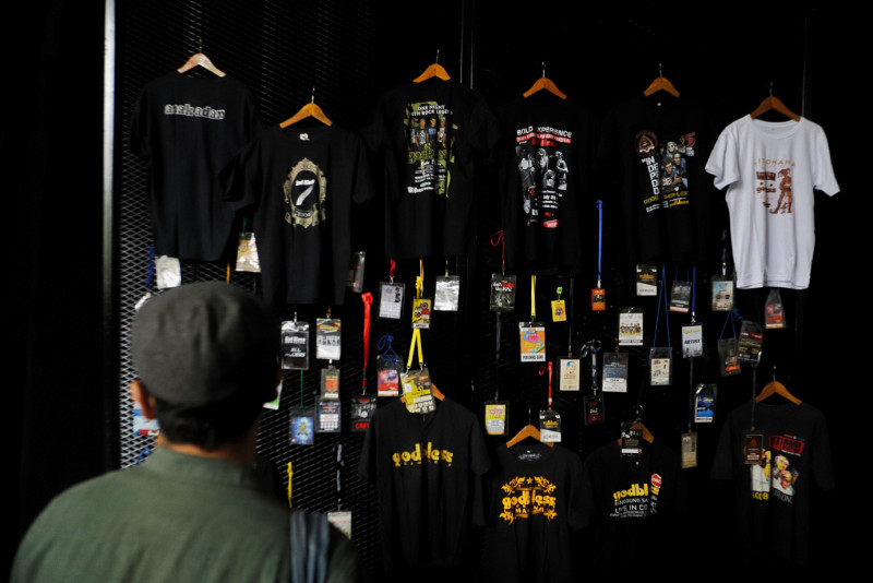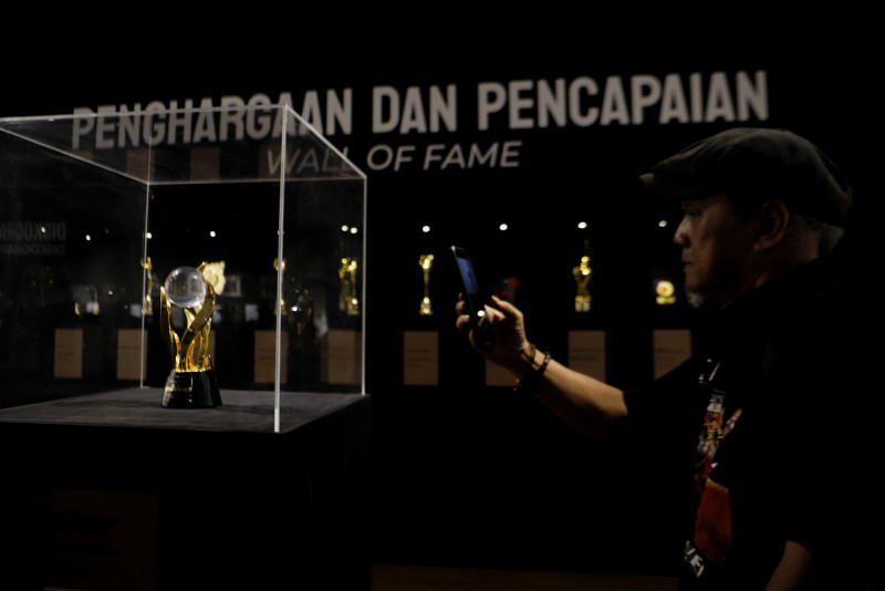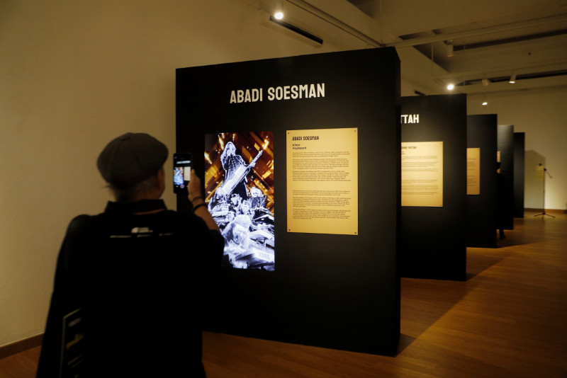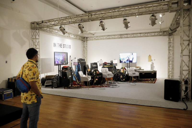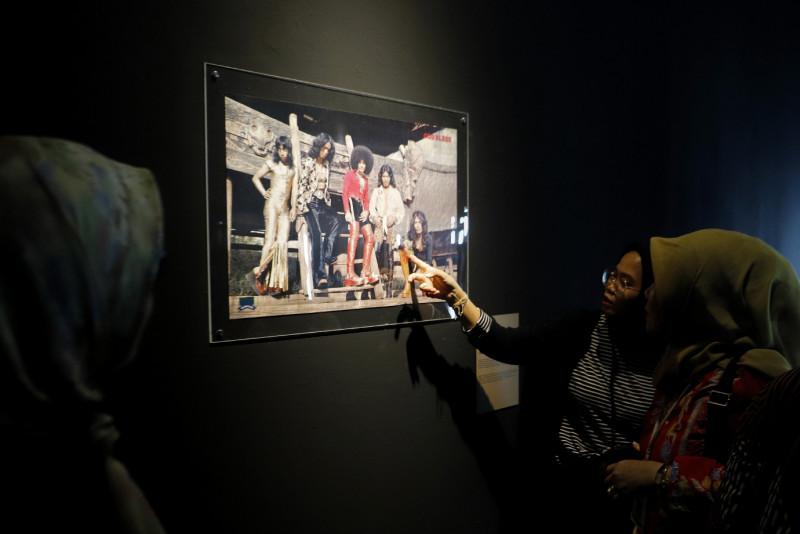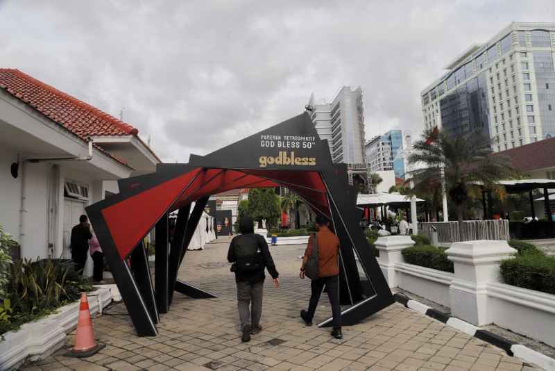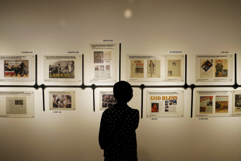 Sejumlah pengunjung melihat pameran Retrospektif God Bless 50 Tahun di Galeri Nasional, Gambir, Jakarta Pusat. Pameran yang menampilkan karya-karya dan pencapaian God Bless ini digelar dalam rangka memperingati 50 tahun perjalanan grup rock legendaris Indonesia tersebut.