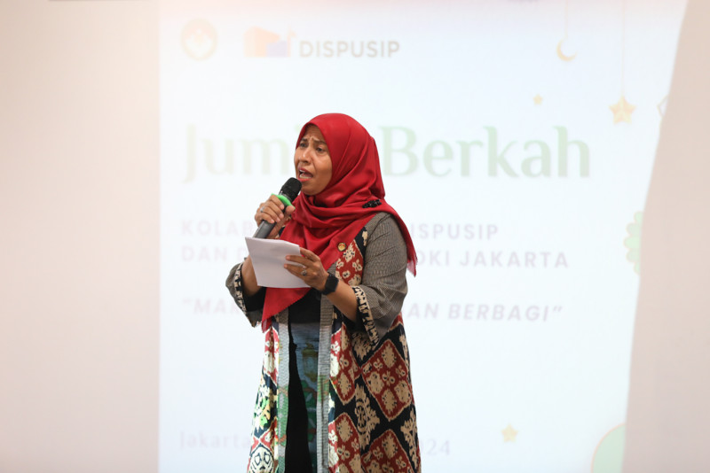 Dharma Wanita Persatuan (DWP) DKI Jakarta bekerja sama dengan DWP Dinas Perpustakaan dan Kearsipan (Dispusip) melaksanakan kegiatan Jumat Berkah di Kantor Dispusip DKI Jakarta, Pulo Gadung, Jakarta Timur, Jumat (23/2). Kegiatan bertema Mari Peduli dengan Berbagi itu diisi dengan pemberian santunan kepada Penyedia Jasa Lainnya Perseorangan (PJLP) di lingkungan Dispusip DKI Jakarta.