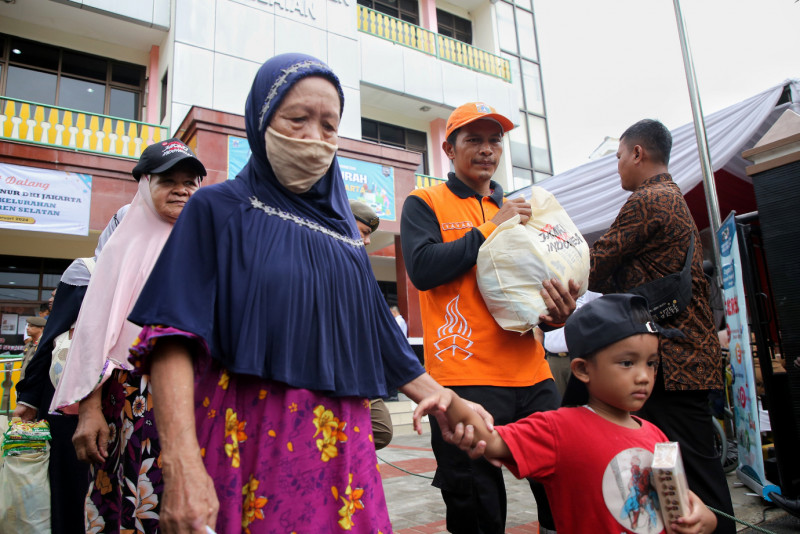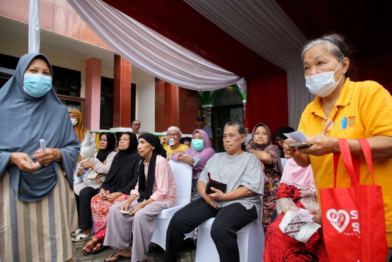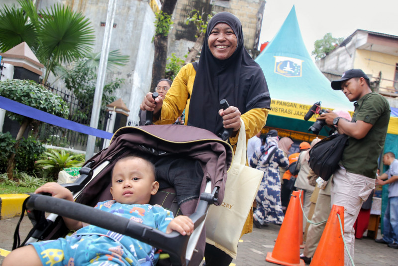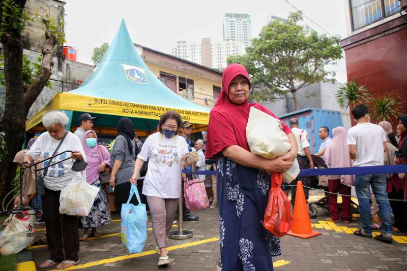 Sejumlah warga prioritas membeli paket sembako murah di Halaman Kelurahan Tanjung Duren Selatan, Grogol Petamburan, Jakarta Barat, Senin (26/2). Warga prioritas yang terdiri dari lansia, ibu hamil dan orang tua yang membawa anak kecil ini diberikan jalur khusus agar mempermudah mereka saat membeli paket sembako murah.