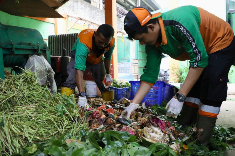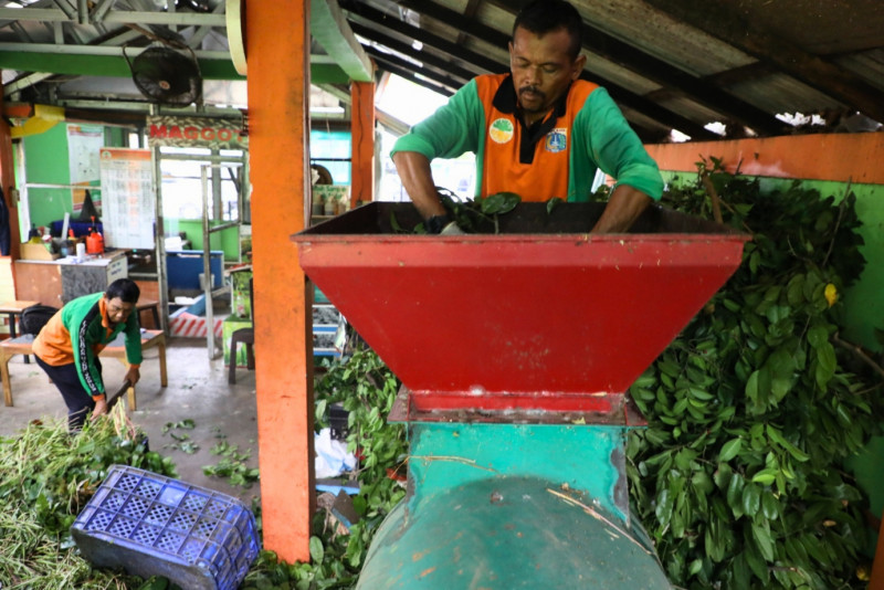 Petugas Satuan Pelaksana Lingkungan Hidup (Satpel LH) Kecamatan Gambir mengolah limbah sampah organik menjadi kompos di Tempat Pengolahan Sampah Reduce, Reuse and Recycle (TPS 3R) Ketapang, Jalan Kyai Haji Zainul Arifin, Duri Pulo, Jakarta Pusat, Selasa (27/2). Dalam sebulan petugas dapat membuat 100 kilogram pupuk kompos.
