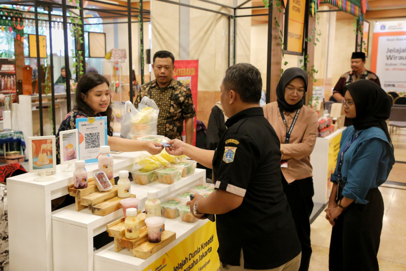 Dinas Perindustrian, Perdagangan, Koperasi, Usaha Kecil Menengah (PPKUKM) DKI Jakarta menggelar Bazar UMKM Jakarta bertema ‘Jelajah Dunia Kreatif Wirausaha Jakarta’ di Balai Kota DKI Jakarta, Selasa (27/2). Bazar yang diikuti sebanyak 45 UMKM binaan (Jakpreneur) terdiri dari kuliner, kriya dan fesyen ini digelar pada 26-29 Februari 2024.