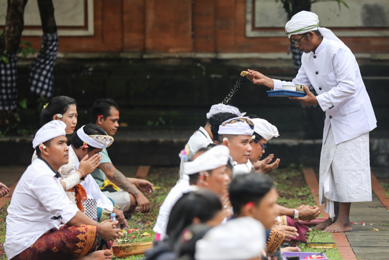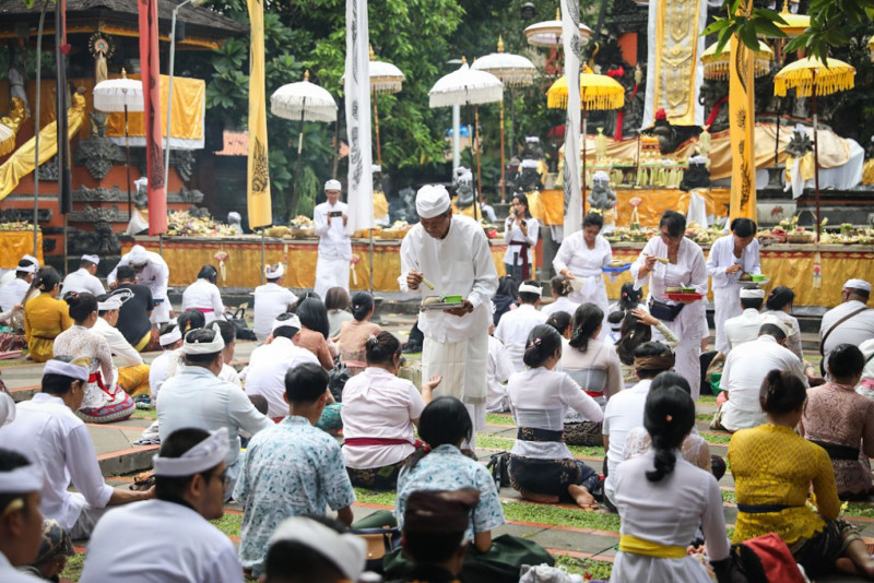 Ratusan umat Hindu mengikuti persembahyangan Hari Raya Galungan di Pura Aditya Jaya, Rawamangun, Pulo Gadung, Jakarta Timur, Rabu (28/2). Hari Raya Galungan merupakan simbol perayaan kemenangan kebaikan (dharma) melawan kejahatan (adharma) yang diperingati umat Hindu setiap 210 hari sekali.