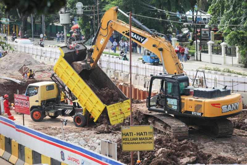 Sejumlah pekerja melakukan pembangunan konstruksi LRT Jakarta fase 1B rute Velodrome-Manggarai di Jalan Pemuda, Pulo Gadung, Jakarta Timur, Kamis (29/2). Per Februari 2024, progres LRT Jakarta memasuki pekerjaan struktur layang atau viaduct dengan pengeboran pondasi (boredpile) di 129 titik.