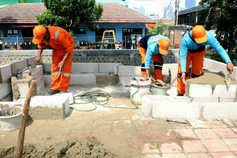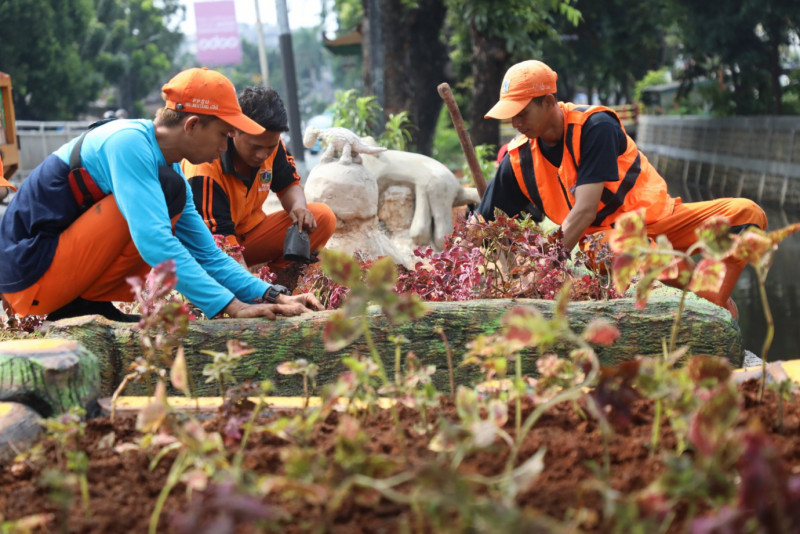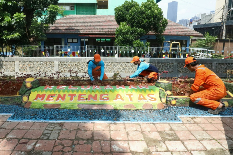 Petugas Penanganan Prasarana dan Sarana Umum (PPSU) Kelurahan Menteng Atas mengerjakan penataan kawasan unggulan triwulan I di Jalan Dr. Saharjo, Menteng Atas, Setiabudi, Jakarta Selatan, Jumat (1/3). Penataan Kawasan yang memilki luas 75 meter persegi ini nantinya dilengkapi fasilitas tempat duduk, refleksi, serta dihiasi patung berbentuk binatang dan ditanami berbagai tanaman hias mulai dari miana merah, miana hijau, begonia, melati jepang, pucuk merah dan bougenville yang akan menambah keindahan kawasan unggulan Menteng Atas.