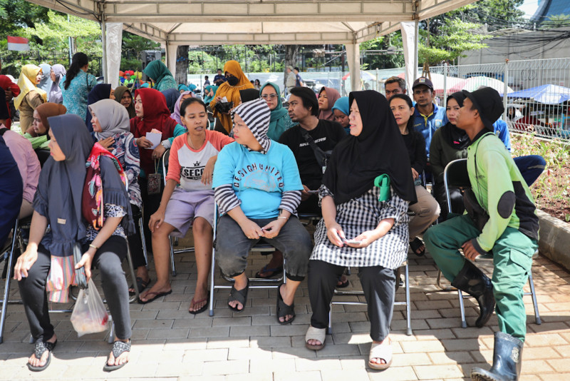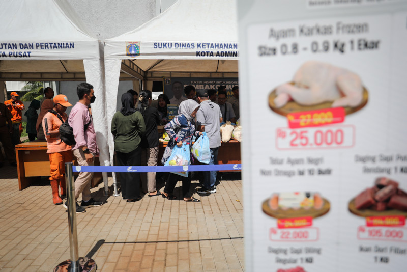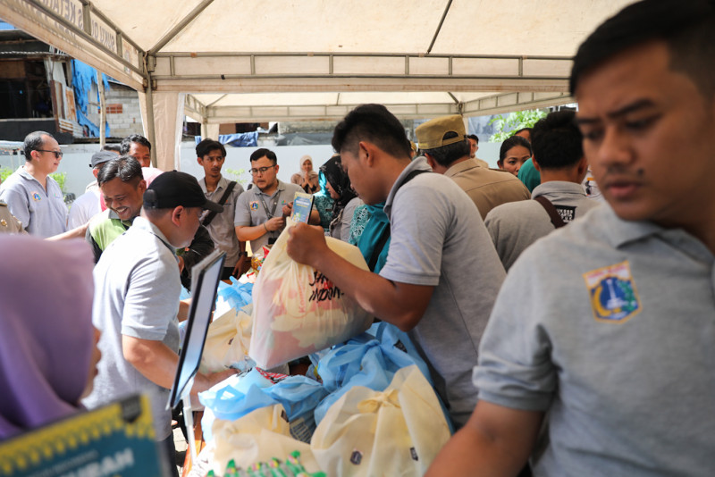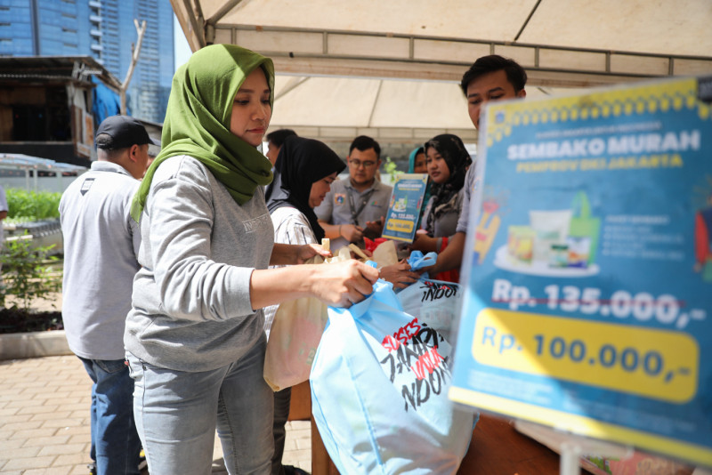 Pemkot Jakarta Pusat bersama TP PKK DKI Jakarta dan Perumda Pasar Jaya menggelar pasar pangan murah di Kantin Swadharma, Karet Tengsin, Tanah Abang, Jakarta Pusat, Senin (4/3). Sebanyak 700 paket pangan dijual pada pasar murah yang diadakan dalam rangka peringatan Hari Kesatuan Gerak (HKG) PKK ke-52 tahun 2024.