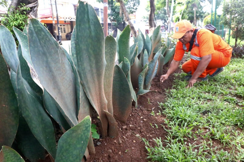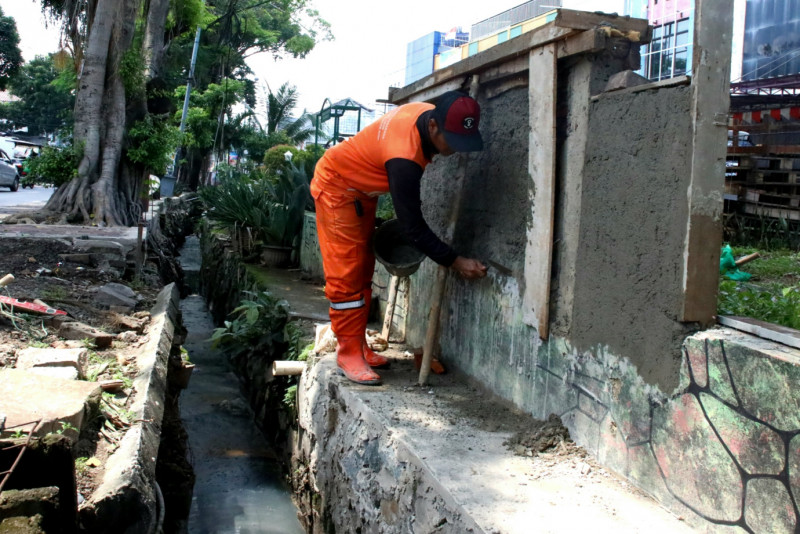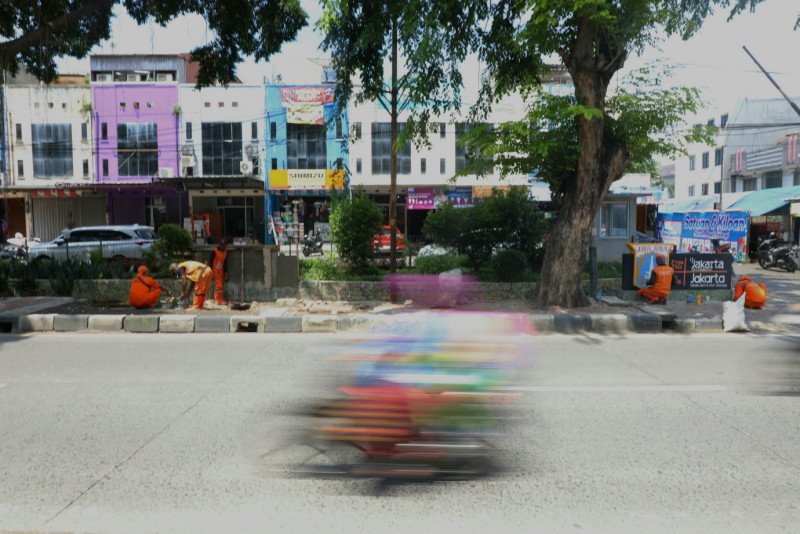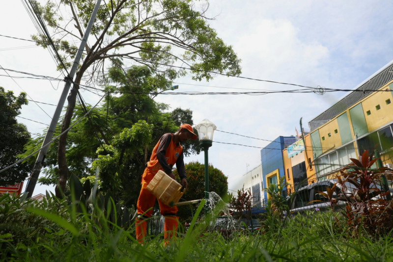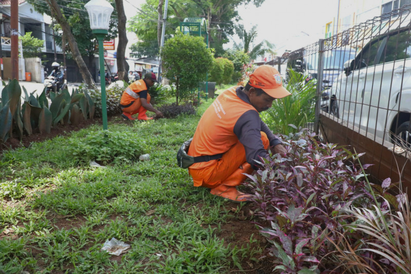 Petugas Penanganan Prasarana dan Sarana Umum (PPSU) Kelurahan Pondok Kopi mengubah lahan tidak terpakai menjadi kawasan unggulan triwulan pertama tahun 2024 di Jalan Pondok Kopi Raya, Kecamatan Duren Sawit, Jakarta Timur, Selasa (5/3). Penataan kawasan dengan luas 200 meter persegi akan dihiasi berbagai jenis tanaman hias seperti cemara air, gandarusa, melati gambir, pucuk merah, bugenvil, aurelia, palem, lidah mertua dan sirih gading.