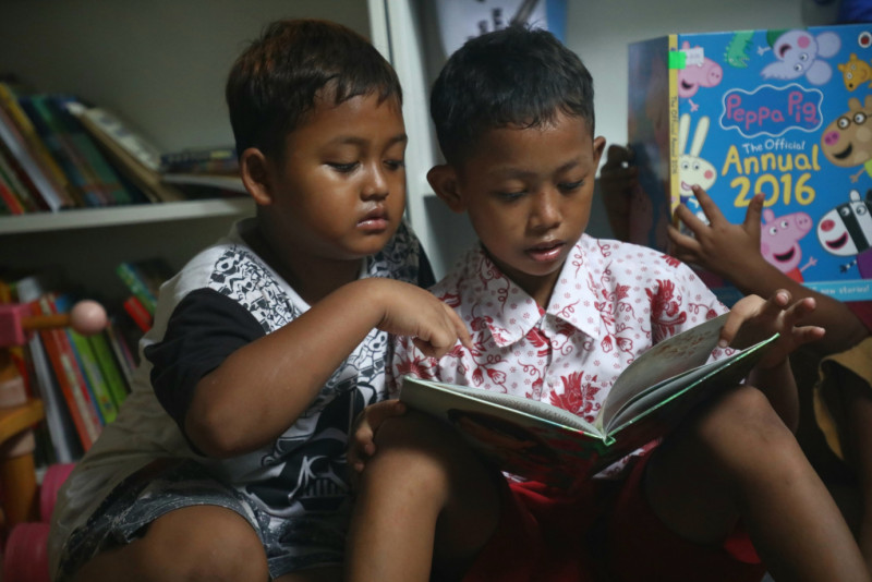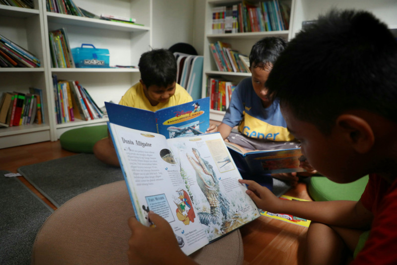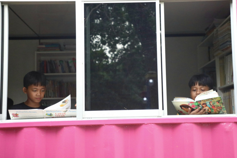 Sejumlah anak-anak menghabiskan waktu dengan membaca di perpustakaan kontainer Ruang Publik Terpadu Ramah Anak (RPTRA) Rawa Badak Utara, Jalan Rawa Binangun VIII, Rawa Badak Utara, Koja, Jakarta Utara, Jumat (8/3). Fasilitas perpustakaan kontainer ini dilengkapi 1000 koleksi buku mulai dari buku cerita sampai dengan buku ilmu pengetahuan yang bisa dibaca oleh pengunjung.