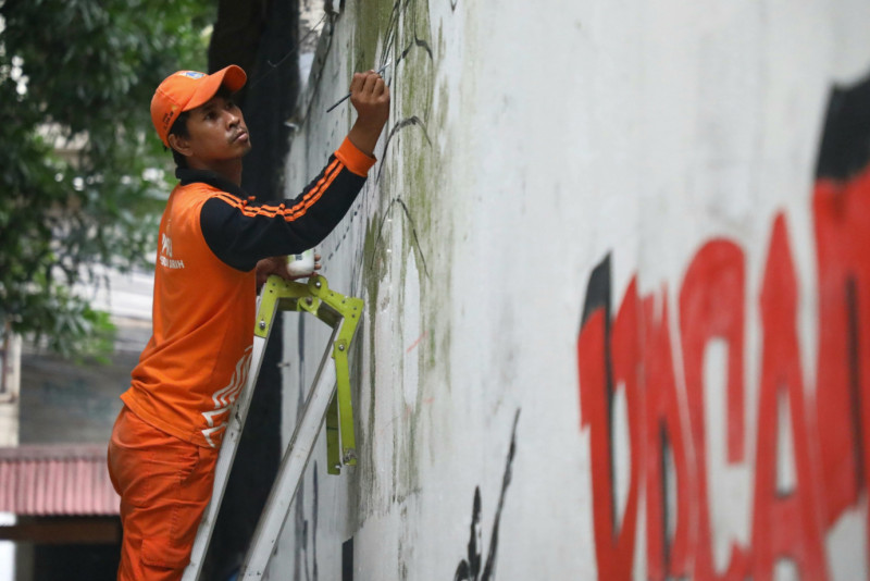 Petugas Penanganan Prasana dan Sarana Umum Kelurahan Kebon Sirih membuat mural dengan tema Jakarya Global City di Gang Kebon Sirih Barat 6, Menteng, Jakarta Pusat, Jumat (8/3). Pembuatan mural ini merupakan bagian dari penataan kawasan unggulan triwulan pertama tahun 2024 di kelurahan ini.
