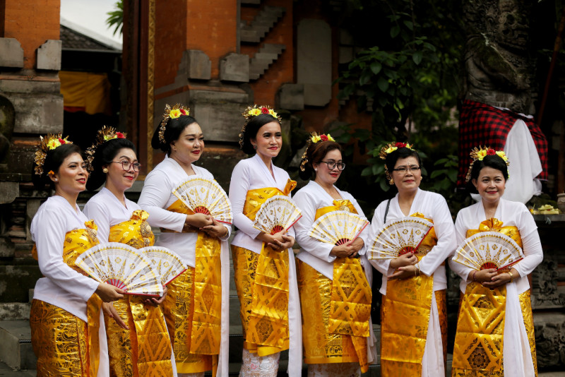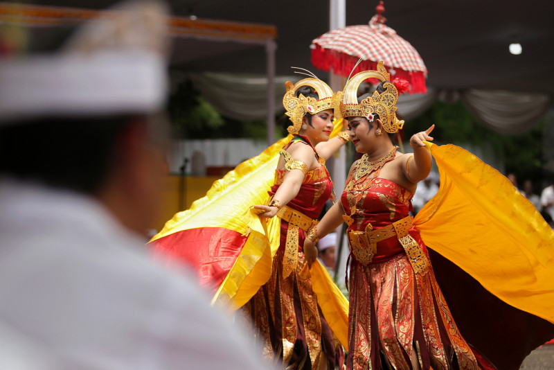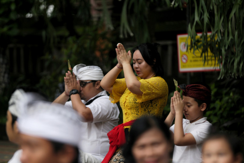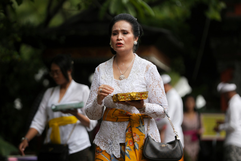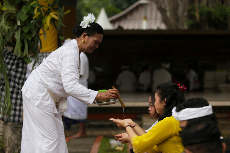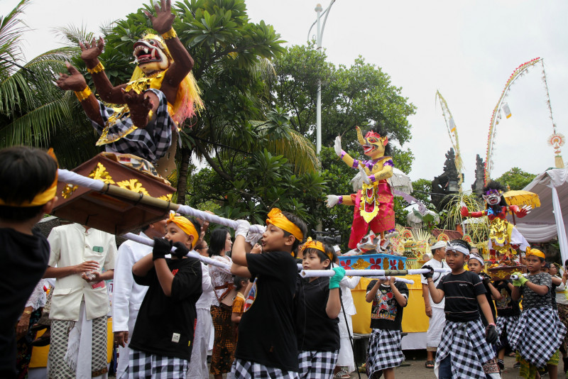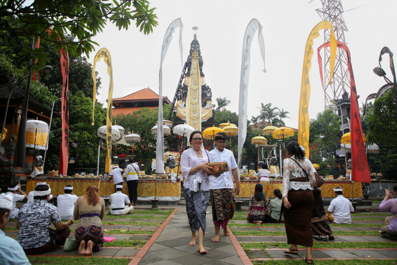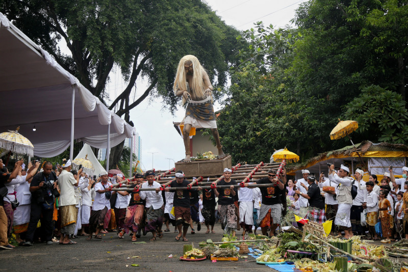 Umat Hindu mengikuti rangkaian prosesi Upacara Tawur Agung Kesanga dalam rangka menyambut Hari Suci Nyepi Tahun Baru Saka 1946 di Pura Adhitya Jaya, Rawamangun, Pulo Gadung, Jakarta Timur, Minggu (10/3). Upacara yang merupakan prosesi sehari sebelum Hari Raya Nyepi tersebut memiliki makna bagi umat Hindu untuk mengusir keburukan dari lingkungan sekitar.