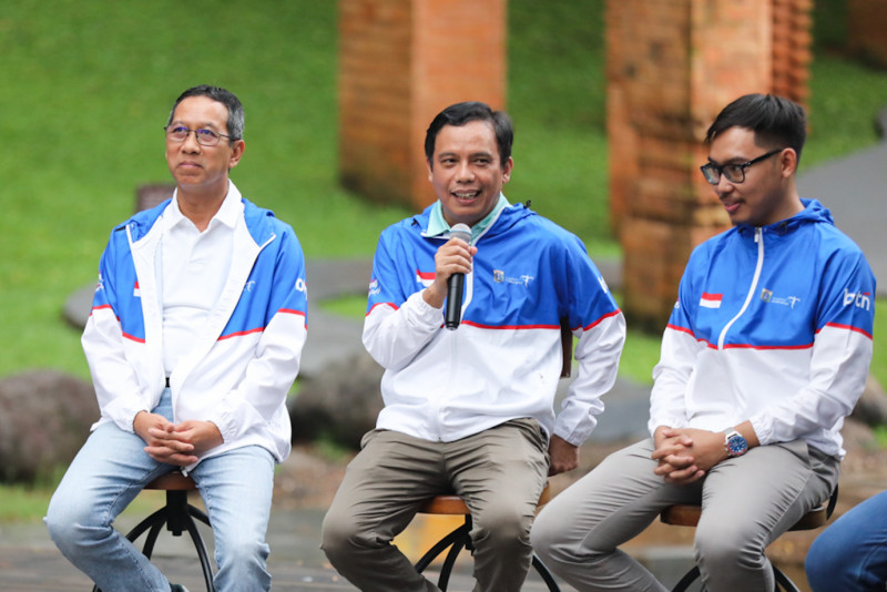 Penjabat (Pj) Gubernur DKI Jakarta, Heru Budi Hartono dan Direktur Utama BTN, Nixon LP Napitupulu menggelar konferensi pers sekaligus peluncuran BTN Jakarta International Marathon (JAKIM) 2024 di Hutan Kota Plataran GBK, Tanah Abang, Jakarta Pusat, Minggu (10/3). Ajang BTN Jakarta International Marathon digelar untuk memeriahkan HUT ke-497 Kota Jakarta sekaligus upaya meningkatkan sport tourism.