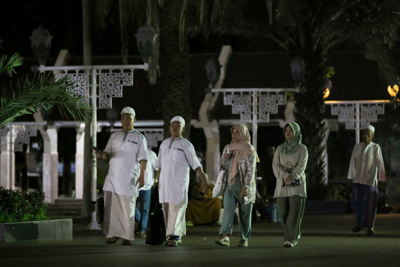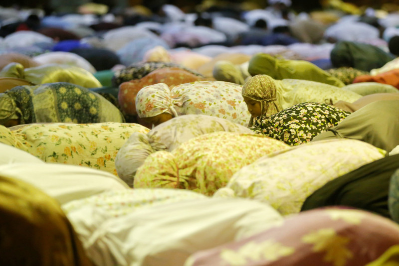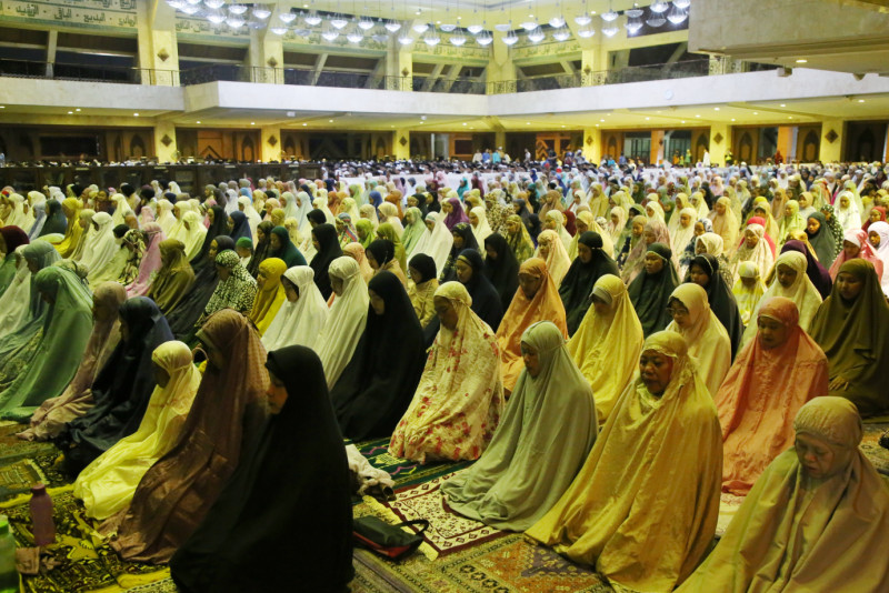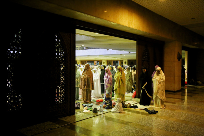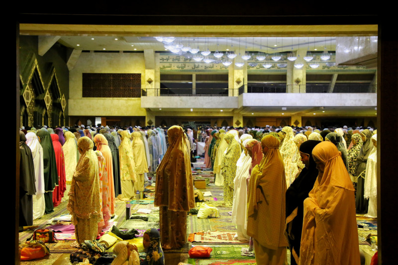 Sejumlah umat muslim melaksanakan Salat Tarawih perdana pada Ramadan 1445 Hijiriah di Masjid Agung At-Tin, Pinang Ranti, Makasar, Jakarta Timur, Senin (11/3). Masjid Agung At-Tin sendiri dapat menampung sekitar 12.000 jamaah, dengan rincian, 5.000 jamaah di lantai dasar, 4.000 jamaah di lantai atas dan 3.000 jamaah di lantai bawah. #ramadan2024