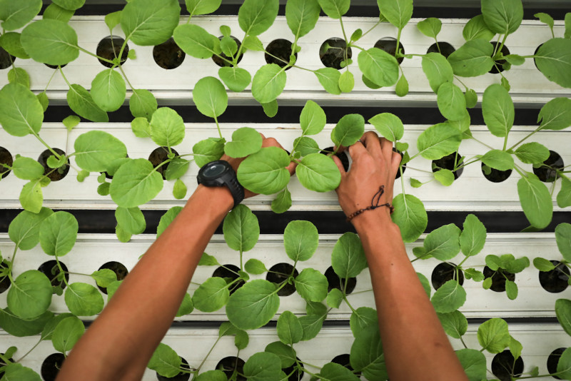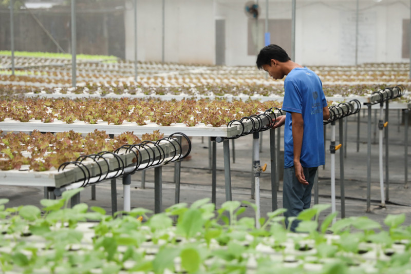 Sejumlah santri melakukan budi daya tanaman dengan sistem hidroponik di Pondok Pesantren Ulul Ilmi, Cipayung, Jakarta Timur, Kamis (14/3). Pertanian perkotaan (urban farming) binaan Dinas Ketahanan Pangan, Kelautan, dan Pertanian (KPKP) DKI Jakarta tersebut membudidayakan sejumlah tanaman seperti cesim, palgoda, selada merah, red oakleaf, green oakleaf dan kangkung.