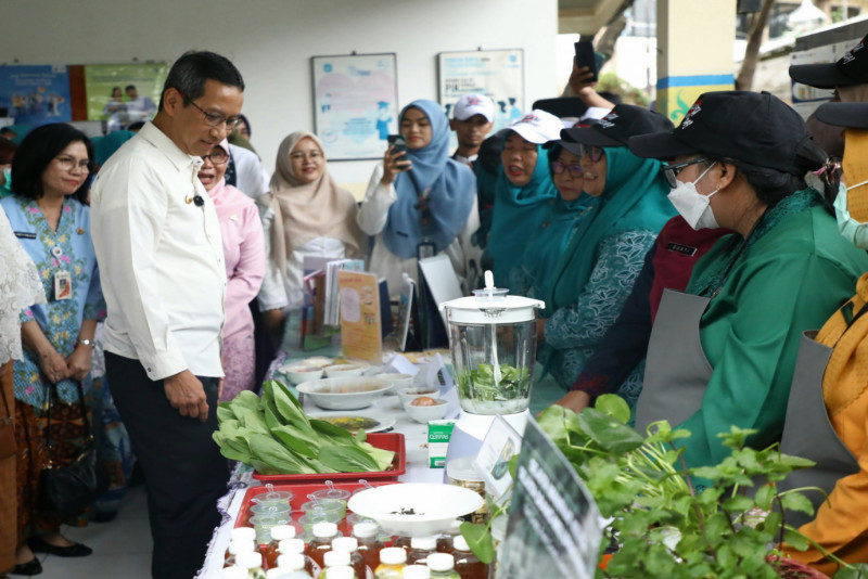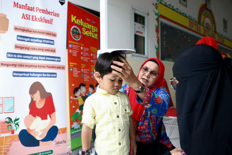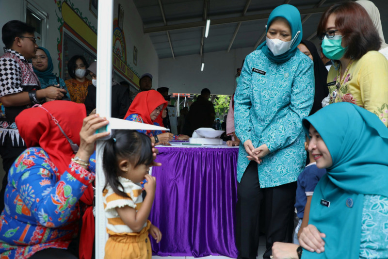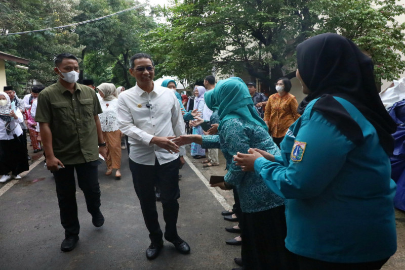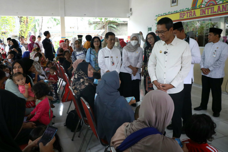 Penjabat (Pj) Gubernur DKI Jakarta, Heru Budi Hartono didampingi Pj Ketua Tim Penggerak Pemberdayaan dan Kesejahteraan Keluarga (TP PKK) Mirdiyanti Heru, memantau intervensi percepatan penurunan stunting terintegrasi di RPTRA Intiland Teduh, Cilincing, Jakarta Utarau, Jumat (15/3). Kegiatan ini merupakan upaya penurunan angka stunting di antaranya pelaksanaan Posyandu anak, pemberian suplemen tablet tambah darah, serta pemenuhan pangan bergizi dan pola pangan yang memenuhi syarat Beragam, Bergizi Seimbang dan Aman (B2SA).
