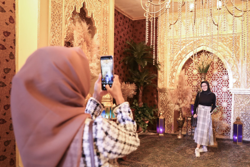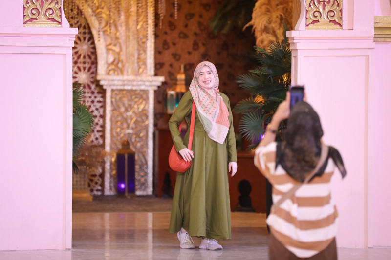Sejumlah pengunjung berfoto dan mengunjungi instalasi masjid di dalam Mal Senayan City, Tanah Abang, Jakarta Pusat, Sabtu (16/3). Mal Senayan City membuat dekorasi berupa instalasi masjid bergaya arsitektur Indo-Islamic dalam rangka menyambut bulan suci Ramadan 1445 Hijriah. #ramadan2024