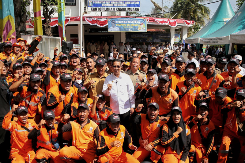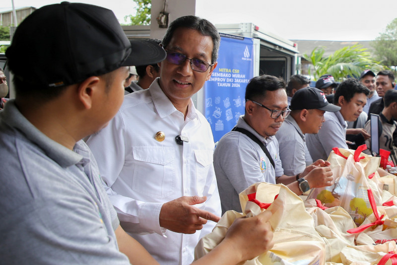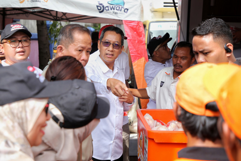 Penjabat (Pj) Gubernur DKI Jakarta, Heru Budi Hartono meninjau kegiatan Sembako Murah di Kantor Kelurahan Kamal Muara, Penjaringan, Jakarta Utara, Senin (18/3). Terhitung sejak pertama kali diadakan Sembako Murah, tercatat sebanyak 50 mitra lintas sektor ikut terlibat dan mendukung program tersebut, baik dari lingkup internal Pemprov DKI Jakarta serta mitra pendukung seperti BUMN, instansi pemerintah lainnya, perusahaan swasta, serta komunitas.