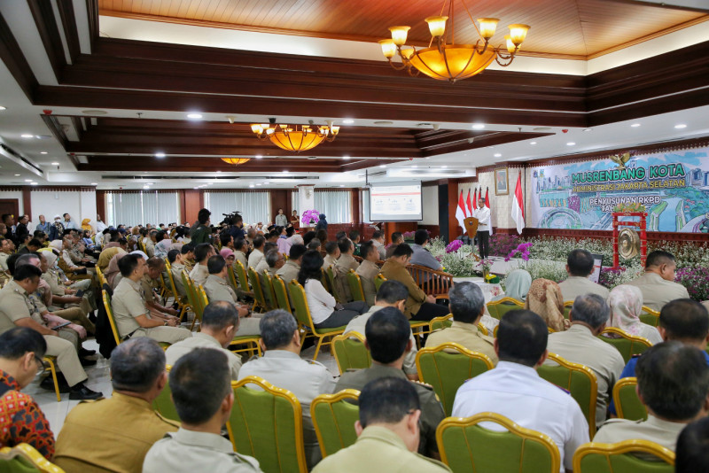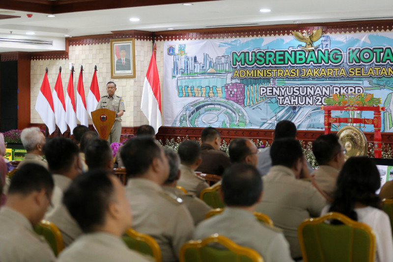 Penjabat (Pj) Gubernur DKI Jakarta, Heru Budi Hartono membuka Musyawarah Perencanaan Pembangunan (Musrenbang) Kota Jakarta Selatan Tahun 2024 untuk menyusun Rencana Kerja Pemerintah Daerah (RKPD) DKI Jakarta Tahun 2025 di Kantor Walikota Jakarta Selatan, Selasa (19/3). Penyelenggaraan Musrenbang Kota Administrasi Jakarta Selatan tahun 2024 dilaksanakan secara berjenjang dari 574 Rukun Warga (RW) yang melaksanakan rembuk RW, dihasilkan sebanyak 2.333 usulan yang terdiri dari 1.892 usulan fisik dan 441 usulan barang.