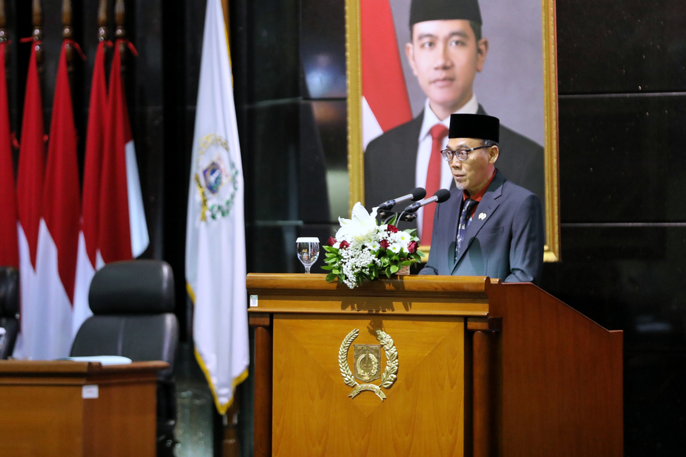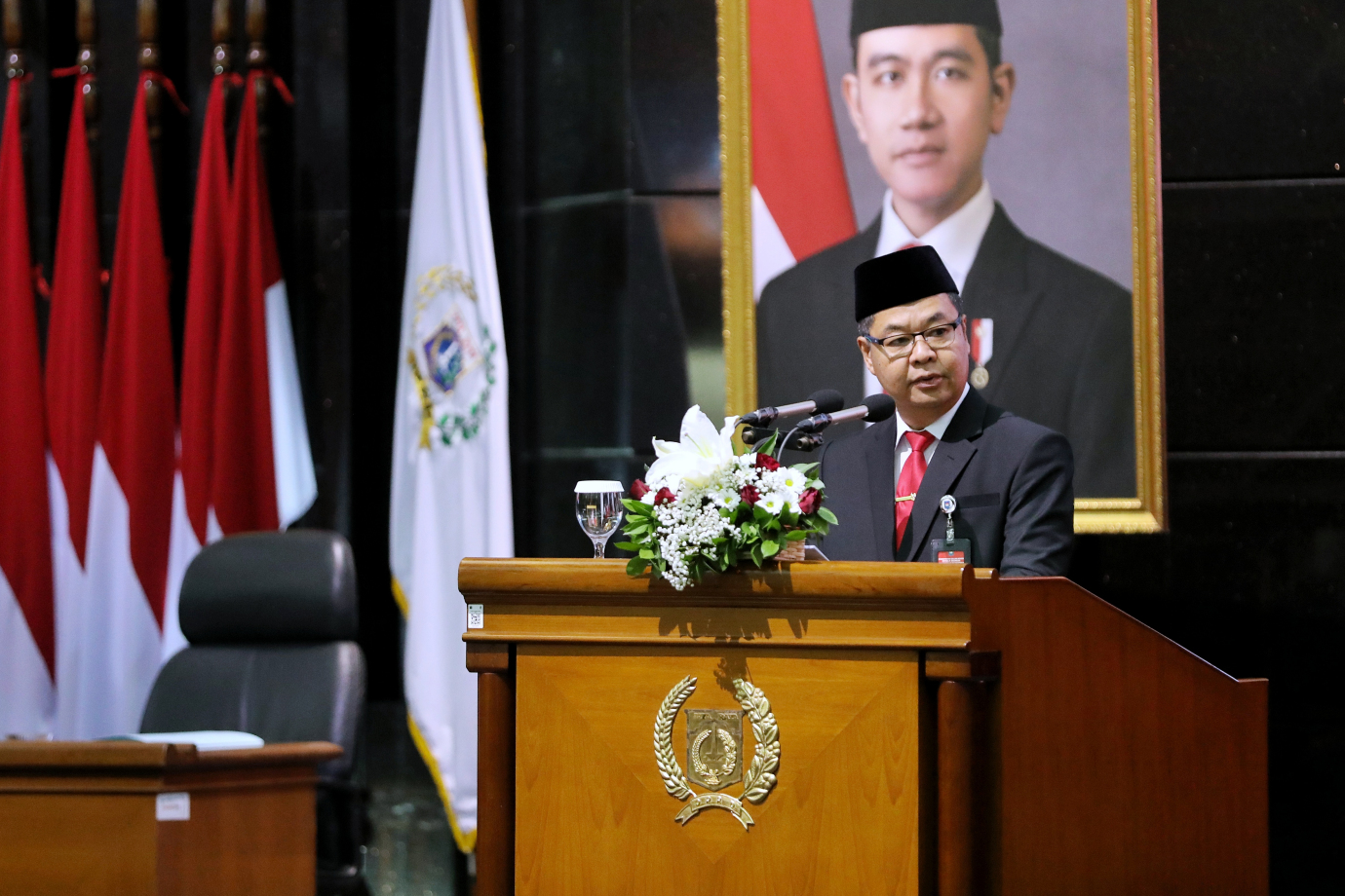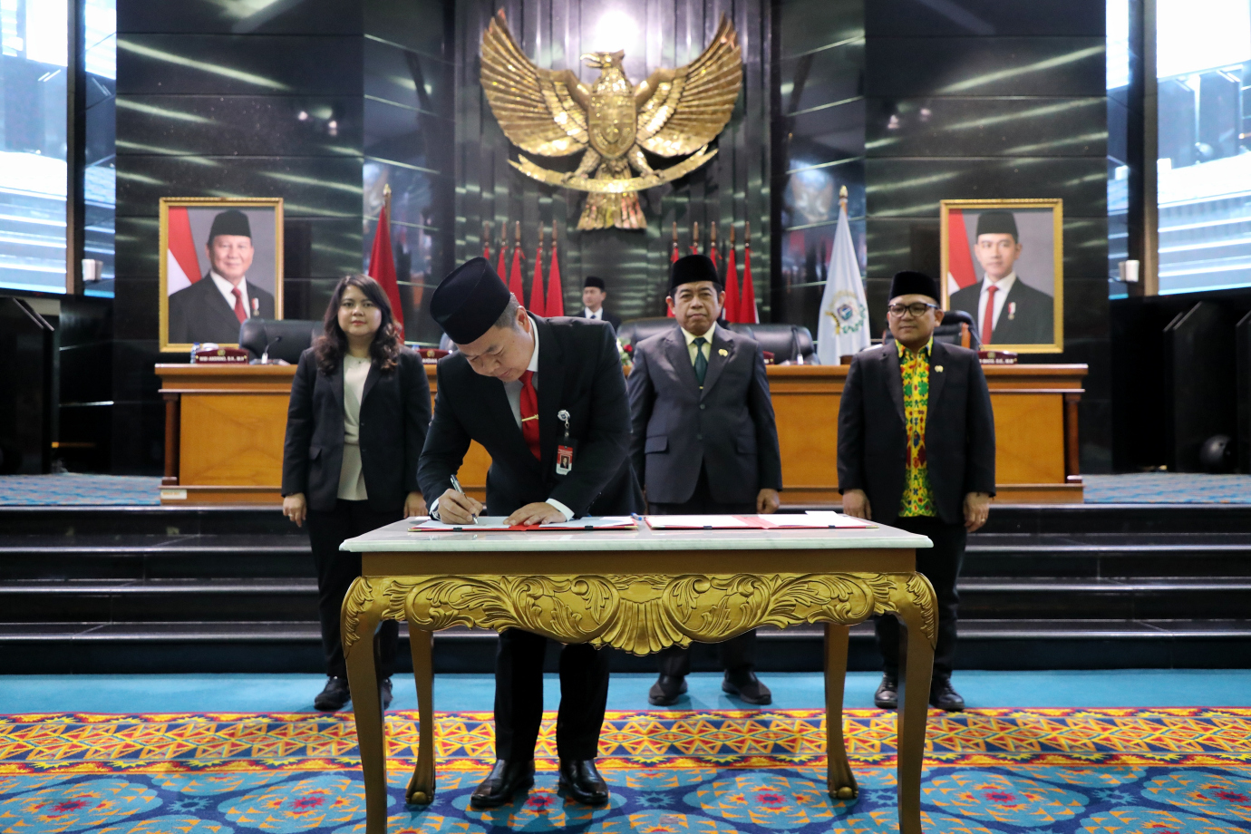 Penjabat (Pj) Gubernur DKI Jakarta, Heru Budi Hartono menghadiri Rapat Paripurna Dewan Perwakilan Rakyat Daerah (DPRD) Provinsi DKI Jakarta di gedung DPRD DKI Jakarta, Jalan Kebon Sirih, Menteng, Jakarta Pusat, Rabu (20/3). Rapat paripurna tersebut menyepakati tiga Rancangan Peraturan Daerah (Raperda) tentang Pendaftaran Penduduk dan Pencatatan Sipil, Lembaga Musyawarah Kelurahan (LMK) dan Pengelolaan Kepulauan Seribu.