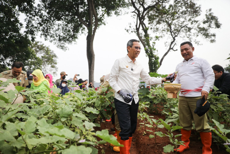Penjabat (Pj) Gubernur DKI Jakarta, Heru Budi Hartono dan Wali Kota Jakarta Timur, M. Anwar melakukan panen raya di lahan RPTRA Payung Tunas Teratai, Cipayung, Jakarta Timur, Selasa (2/4). Panen raya pertanian, peternakan dan perikanan tersebut dilakukan serentak secara virtual di seluruh wilayah Jakarta Timur.