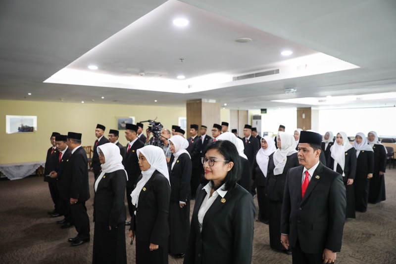 Sekretaris Daerah DKI Jakarta, Joko Agus Setyono melantik sejumlah pejabat administrator dan pejabat pengawas di Grha Ali Sadikin Balai Kota, Gambir, Jakarta Pusat, Kamis (4/4). Pelantikan tersebut ditujukan bagi 35 pejabat eselon III dan IV dengan rincian 21 pejabat promosi dan 14 pejabat mengalami mutasi.