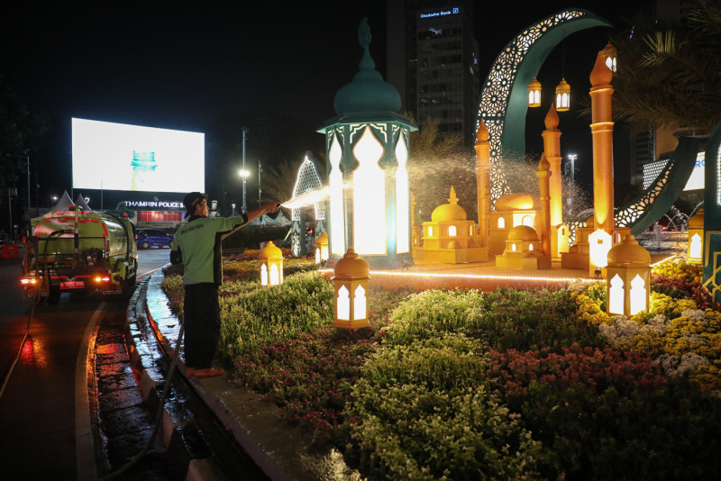Petugas Dinas Pertamanan dan Hutan Kota (Distamhut) DKI Jakarta merawat tanaman pada dekorasi Idulfitri di Bundaran Hotel Indonesia, Menteng, Jakarta Pusat, Selasa (9/4). Dekorasi berbentuk masjid dengan hiasan lentera dan bulan sabit tersebut dihadirkan untuk menyemarakkan Hari Raya Idulfitri 1445 Hijriah. #lebaran2024