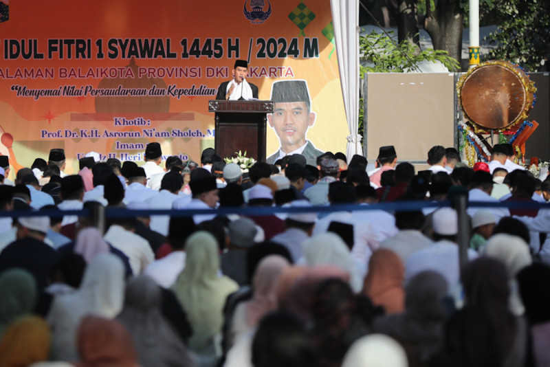 Pemerintah Provinsi (Pemprov) DKI Jakarta menggelar ibadah salat Idulfitri 1445 Hijriah di halaman Balai Kota, Gambir, Jakarta Pusat, Rabu (10/4). Ibadah salat Idulfitri dipimpin oleh imam Ustaz H Heri Kuswanto dan khotbah oleh KH Asrorun Ni\'am Sholeh serta dihadiri oleh Sekretaris Daerah Provinsi DKI Jakarta, Joko Agus Setyono. #lebaran2024