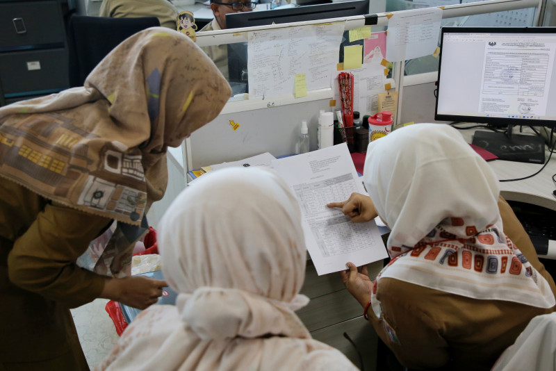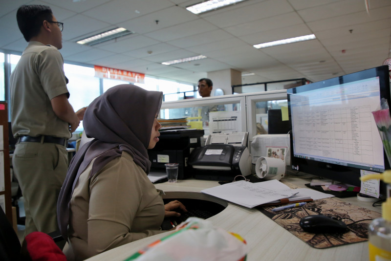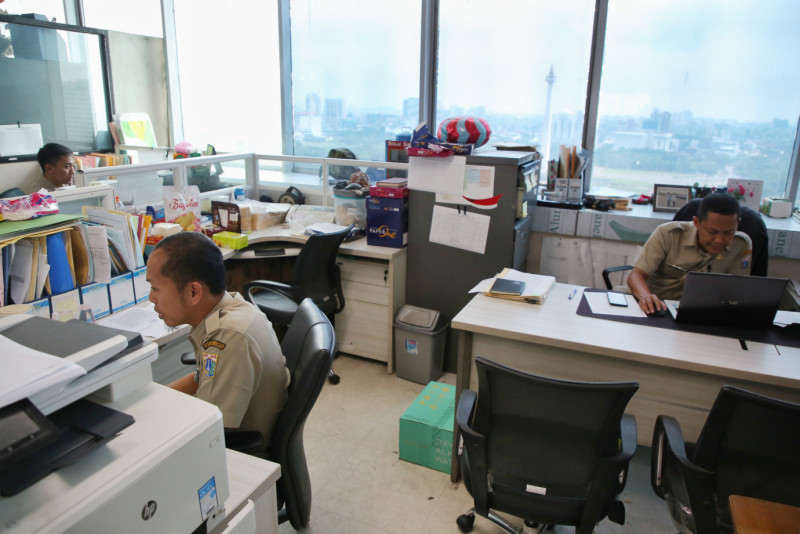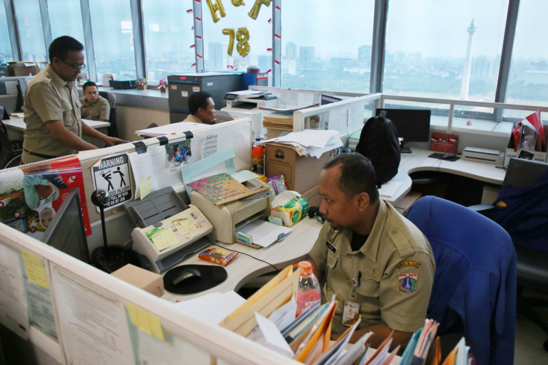 Aparatur sipil negara (ASN) beraktivitas saat hari pertama kerja usai cuti Lebaran 1445 Hijriah di gedung Balai Kota DKI Jakarta, Gambir, Jakarta Pusat, Selasa (16/4). Pemerintah Provinsi DKI Jakarta tidak menerapkan work from home (WFH) atau kerja dari rumah pada hari pertama kerja pasca libur Lebaran 2024.