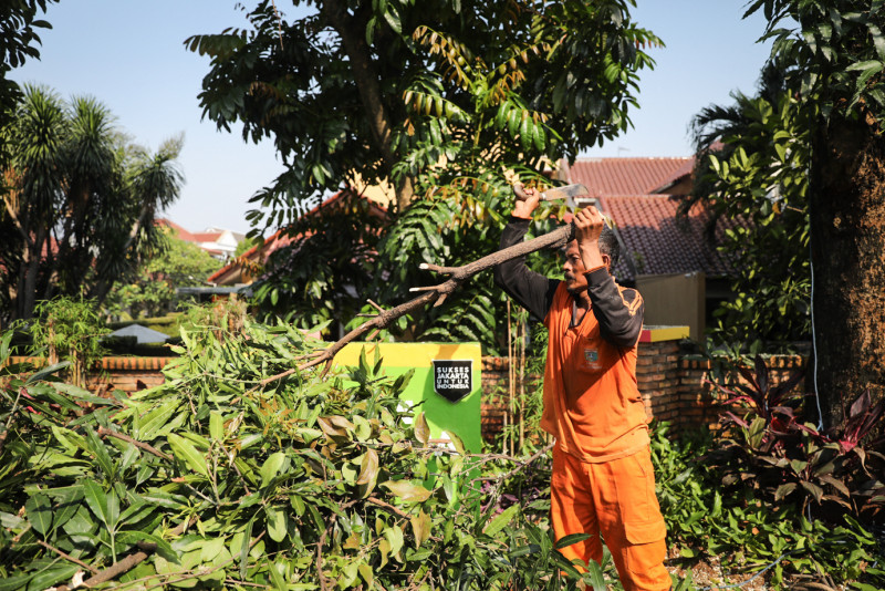 Petugas Penanganan Prasarana dan Sarana Umum (PPSU) Kelurahan Jagakarsa melakukan penopingan pohon di Jalan Kebagusan Raya, Jagakarsa, Jakarta Selatan, Rabu (17/4). Penopingan pohon dilakukan di area penataan kawasan triwulan pertama tahun 2024 Kelurahan Jagakarsa.