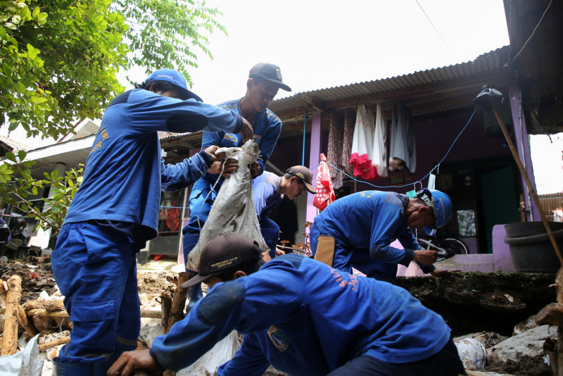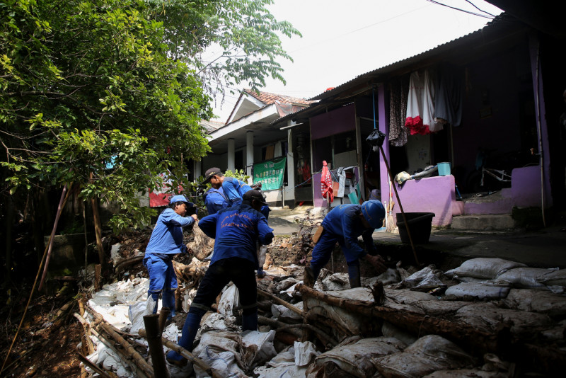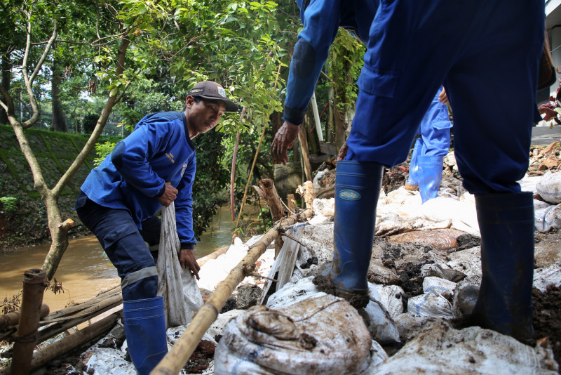 Petugas Satuan Pelaksana (Satpel) SDA Pasar Rebo melakukan perbaikan turap longsor di Kali Baru, Jalan Pedati Selatan, Cijantung, Pasar Rebo, Jakarta Timur, Jumat (19/4). Perbaikan sementara dilakukan dengan melakukan pemasangan kayu dolken serta karung pasir sepanjang 10 meter dengan ketinggian empat meter.