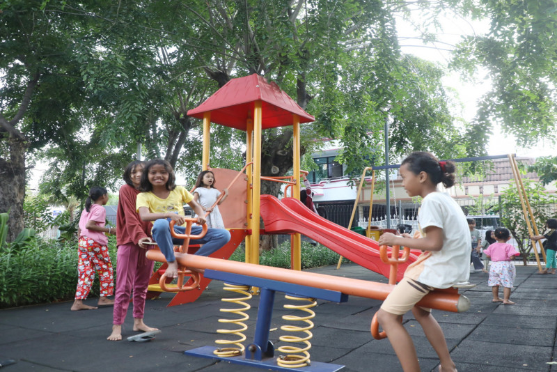 Sejumlah anak menghabiskan waktu sore di Ruang Publik Terpadu Ramah Anak (RPTRA) Sunter Hijau di Jalan Sunter Kirana 1, Sunter Jaya, Tanjung Priok, Jakarta Utara, Jumat (19/4). Berbagai aktivitas dilakukan sejumlah warga seperti bermain, membaca buku dan berolahraga dengan memanfaatkan fasilitas yang ada di RPTRA.