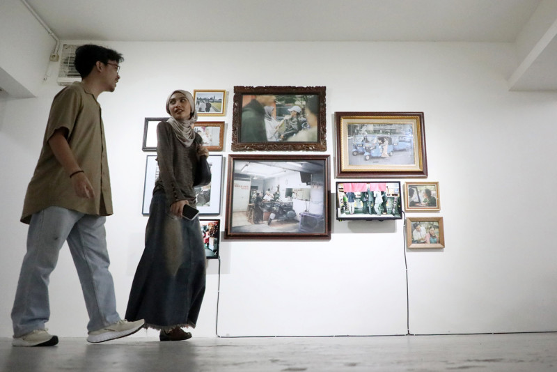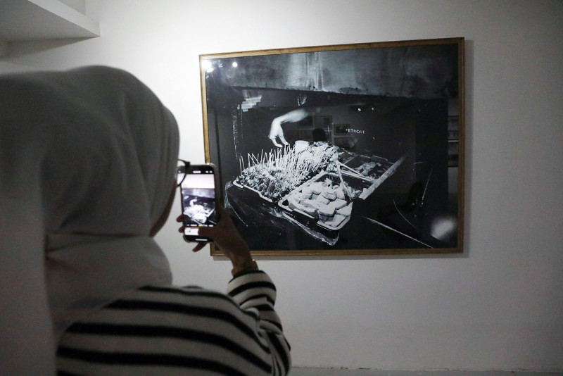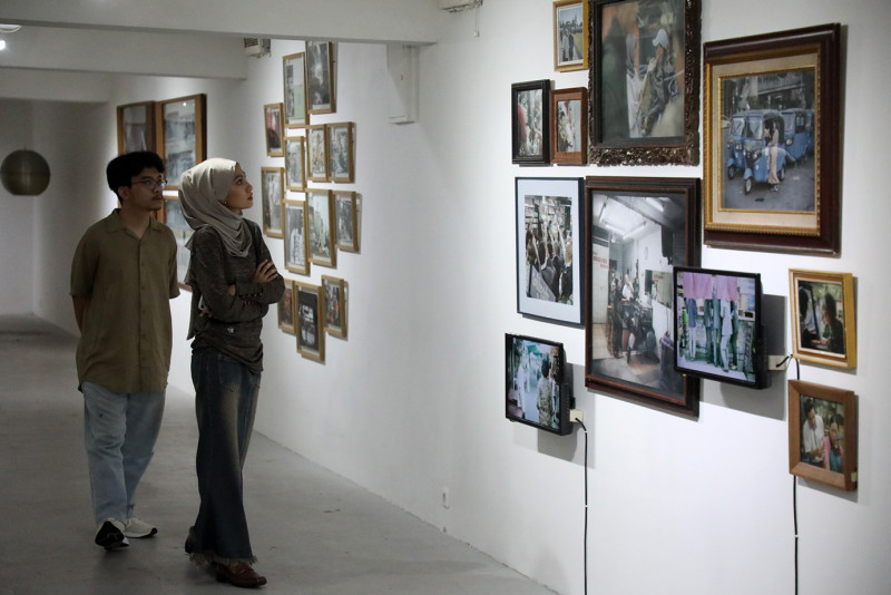 Melihat pameran foto \"Menangkap Gelagat\" di Rubanah Underground Hub, Jalan Timor, Gondangdia, Menteng, Jakarta Pusat, Minggu (21/4). Pameran ini menampilkan puluhan foto karya John Navid yang menggambarkan kehidupan kaum urban di kota besar dari tahun 2015-2022.
