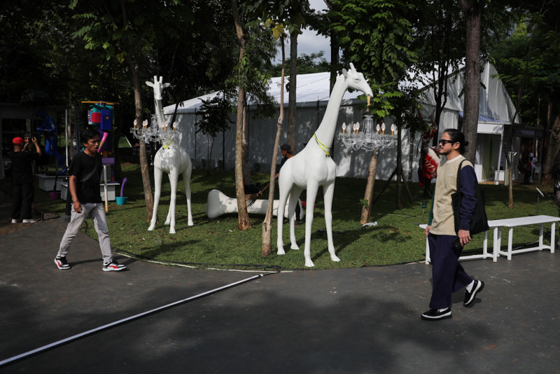 Sejumlah pengunjung melihat sejumlah karya seni dalam bursa seni Art Jakarta Gardens di Hutan Kota Plataran GBK, Senayan, Tanah Abang, Jakarta Pusat, Selasa (23/4). Art Jakarta Gardens 2024 yang menampilkan karya-karya dari 23 galeri seni terkemuka ini berlangsung selama enam hari pada 23 - 28 April 2024.
