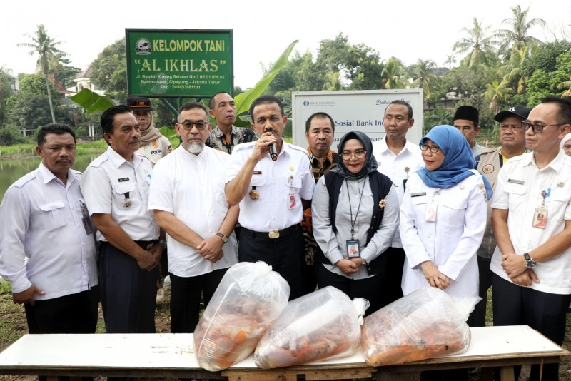 Wali Kota Jakarta Timur, M. Anwar bersama Kepala Dinas Kepala Dinas Ketahanan Pangan, Kelautan dan Pertanian (KPKP) Provinsi DKI Jakarta, Suharini Eliawati, Kepala Perwakilan BI Jakarta, Arlyana Abubakar Serta Kepala Suku Dinas KPKP Jakarta Timur, Ali Nurdin melakukan panen ikan di Kelompok Tani (Poktan) Al-Ikhlas, Cipayung, Jakarta Timur, Rabu (24/4). Total seberat 4 ton ikan nila merah berhasil dipanen pada kegiatan tersebut.
