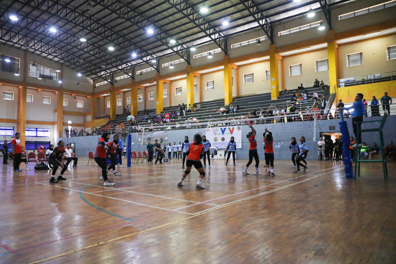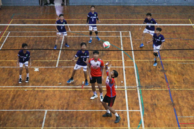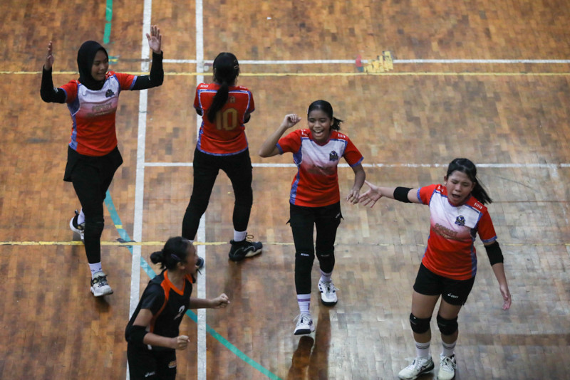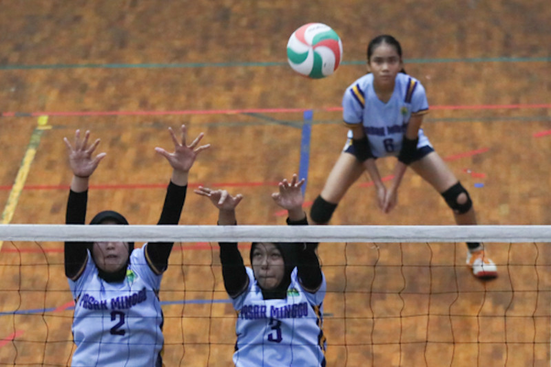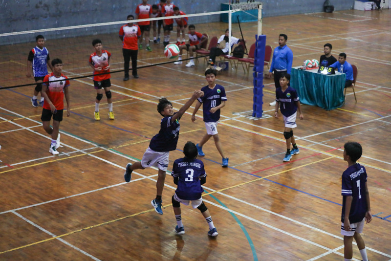 Sejumlah siswa bertanding bola voli dalam Pekan Olahraga Pelajar Kota (Popkot) Jakarta Selatan di GOR Kecamatan Pasar Minggu, Jakarta Selatan, Kamis (25/4). Kompetisi yang digelar oleh Suku Dinas Pemuda dan Olahraga (Sudin Pora) Jakarta Selatan itu diikuti oleh 1.510 siswa yang nantinya diseleksi untuk mengikuti Pekan Olahraga Pelajar tingkat Provinsi DKI Jakarta.