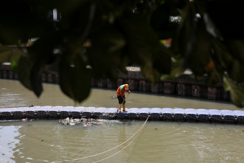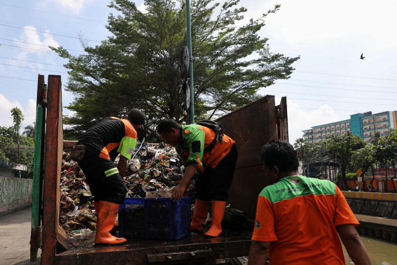 Petugas Unit Penganan Sampah (UPS) Badan Air Dinas Lingkungan Hidup DKI Jakarta mengangkut sampah dari Sungai Ciliwung Lama, Jalan Habib Ali Kwitang, Kwitang, Senen, Jakarta Pusat, Jumat (26/4). Kegiatan yang melibatkan delapan personel ini merupakan kegiatan rutin yang biasa dilakukan setiap hari pada pukul 08.00 hingga 11.00 WIB tergantung banyaknya sampah yang datang.