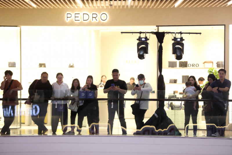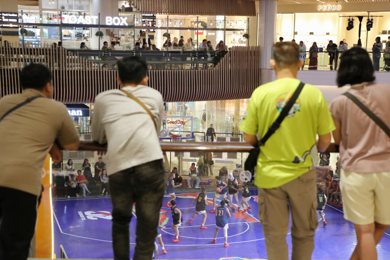 Sejumlah pengunjung tengah asik menikmati pertandingan bola basket yang digelar di Grand Atrium Mall Kota Kasablanka, Tebet, Jakarta Selatan, Jumat (26/4). Pertandingan bola basket yang digelar didalam pusat perbelanjaan ini adalah scrimmage game yang merupakan rangkaian dari DBL Festival 2024.