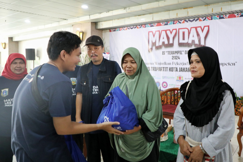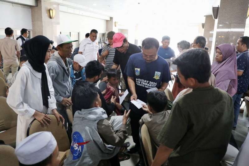 Pemerintah Kota Jakarta Selatan menggelar peringatan May Day di selasar kantor Wali Kota Jakarta Selatan, di Jalan Prapanca, Kelurahan Petogogan, Kecamatan Kebayoran Baru, Rabu (1/5). Kegiatan pemberian santunan dan sembako kepada buruh dan keluarga pekerja yang kekurangan, seperti yatim piatu dan janda ini melibatkan 250 peserta dari lima serikat perkerja di wilayah Jakarta Selatan.